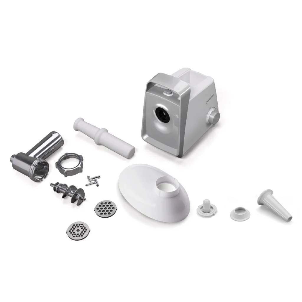 A Gorenje MG1601W húsdarálóhoz tartozik egy tömő eszköz, amely megkönnyíti a húsok adagolását, valamint két különböző méretű darálótárcsa (3 mm-es és 8 mm-es), így a darált hús állagát az étel igényeinek megfelelően állíthatja be. Ezek a tartozékok lehetővé teszik a sokoldalú felhasználást, legyen szó hamburgerről, kolbászról, fasírtokról vagy bármilyen egyéb ételről, amely darált húst igényel.