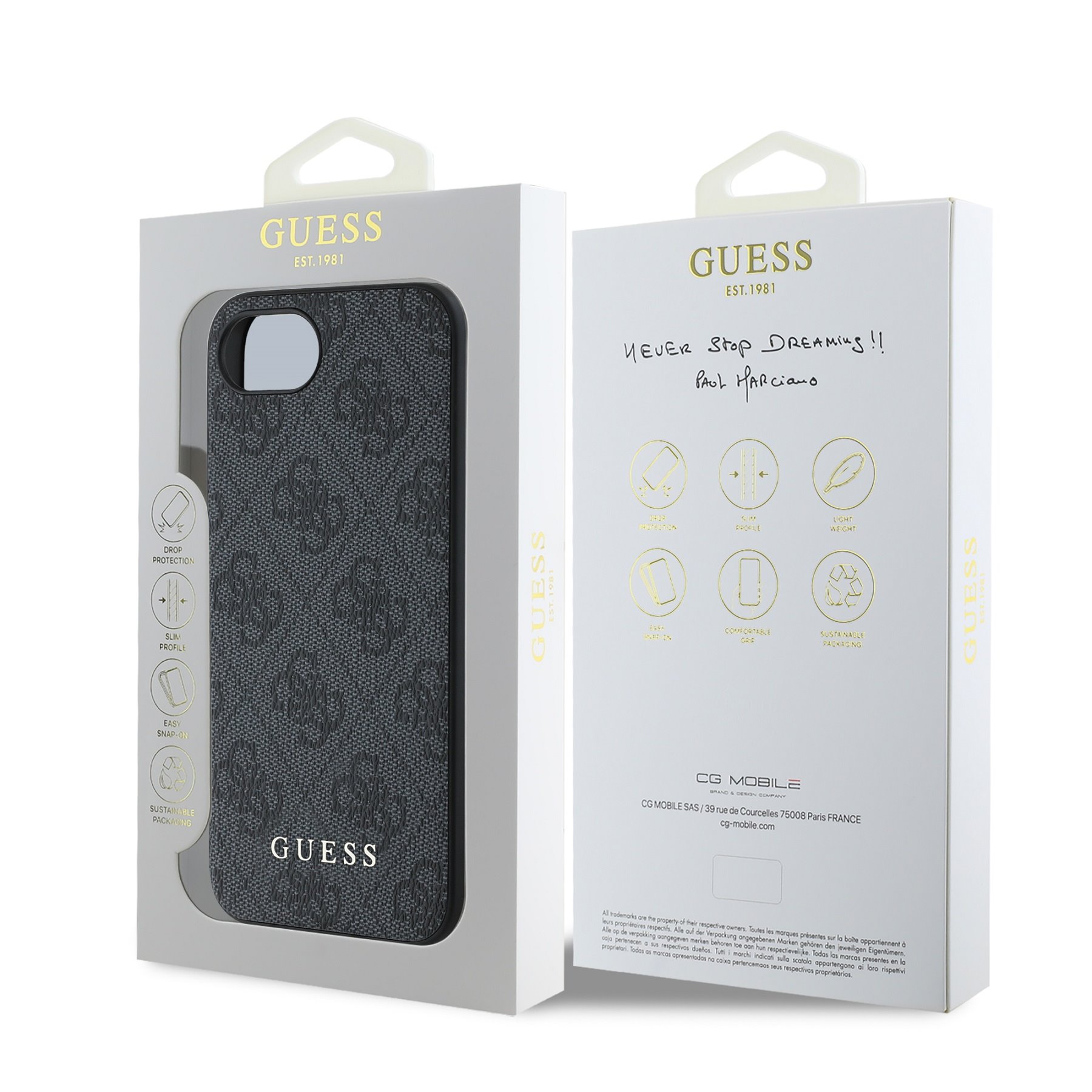A prémium Guess 4G Charm hátlap elegáns, jellegzetes 4G mintával rendelkezik, arany GUESS logóval kiegészítve.