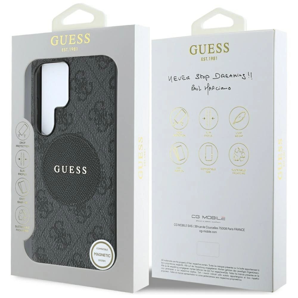 A Guess 4G Kerek Folt Klasszikus Logós MagSafe tok egy exkluzív vonal védőtokokból, amelyek kivételes funkcionalitást és stílusos, egyedi designt egyesítenek. Ez a kollekció azoknak készült, akik nem csak a telefonjuk biztonságát, hanem annak elegáns megjelenését is értékelik. Tökéletes választás minden MagSafe technológiájú készülék tulajdonosának. Az egyedi megjelenés és kivételes minőség az ismert Guess márka exkluzív védőtokja az elegancia és stílus legmagasabb szintjének kombinációja. A tok magas minőségű ökológiai bőrrel van borítva, amely felületét egy jellegzetes 4G mintázat és MagSafe gyűrű díszíti. A tok közepén található Guess logó finoman hangsúlyozza a tok presztízsét. Funkcionalitás és elegáns design tökéletes kombinációja, amelynek köszönhetően a telefonod nem csak jól védett lesz, hanem divatos kiegészítővé is válik. Masszív kivitelezés és tökéletes illeszkedés a gondosan kiválasztott méreteknek köszönhetően a tok hatékonyan párnázza az eséseket, miközben teljes hozzáférést biztosít a portokhoz és gombokhoz. A tok oldala rugalmas, így könnyen fel- és leszerelhető, de mindenekelőtt tökéletesen védi a készülék keretét az ütések vagy esetleges sérülések ellen. A finoman megemelt külső szélek védik a telefon képernyőjét a sérülésektől, míg a kamera lencséje körüli megemelt szélek az optika törését vagy karcolásától óvják. Töltsd telefonodat vezeték nélkül! A tok mágneses gyűrűvel van felszerelve, amely kompatibilis a MagSafe vezeték nélküli töltővel, biztosítva a gyors és egyszerű töltést. A tokba beépített mágnesek tökéletesen illeszkednek a felhasználó telefonjához, és biztosítják az eszköz erős tapadását a MagSafe töltőhöz. A tok a Guess márka licencével készült.