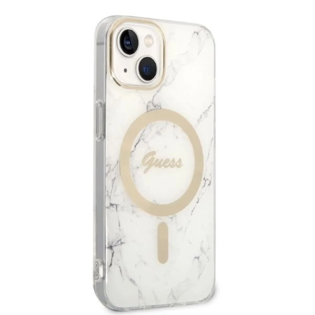 A Márvány kollekció lenyűgöző tokjai ötvözik a modern dizájnt és a szokatlan megjelenést. A Guess márvány tokok időtlen eleganciája lenyűgöz a sajátos tervezésével minden tokban. A tok termoplasztikus poliuretánból készült, és nyers, hideg megjelenése révén karaktert kölcsönöz az iPhone-odnak, és kiemeli a mindennapi stílusodat. Az arany kiegészítők a kamera körüli keret és a Guess divatház emblémája formájában különleges vizuális hatásokat nyújtanak. Az arany kiegészítők használatával a tok melegebb karaktert kap. A legnagyobb használói kényelem érdekében a tok mágneses gyűrűvel van felszerelve, amely kompatibilis a MagSafe technológiával, lehetővé téve a gyors, vezeték nélküli töltést.