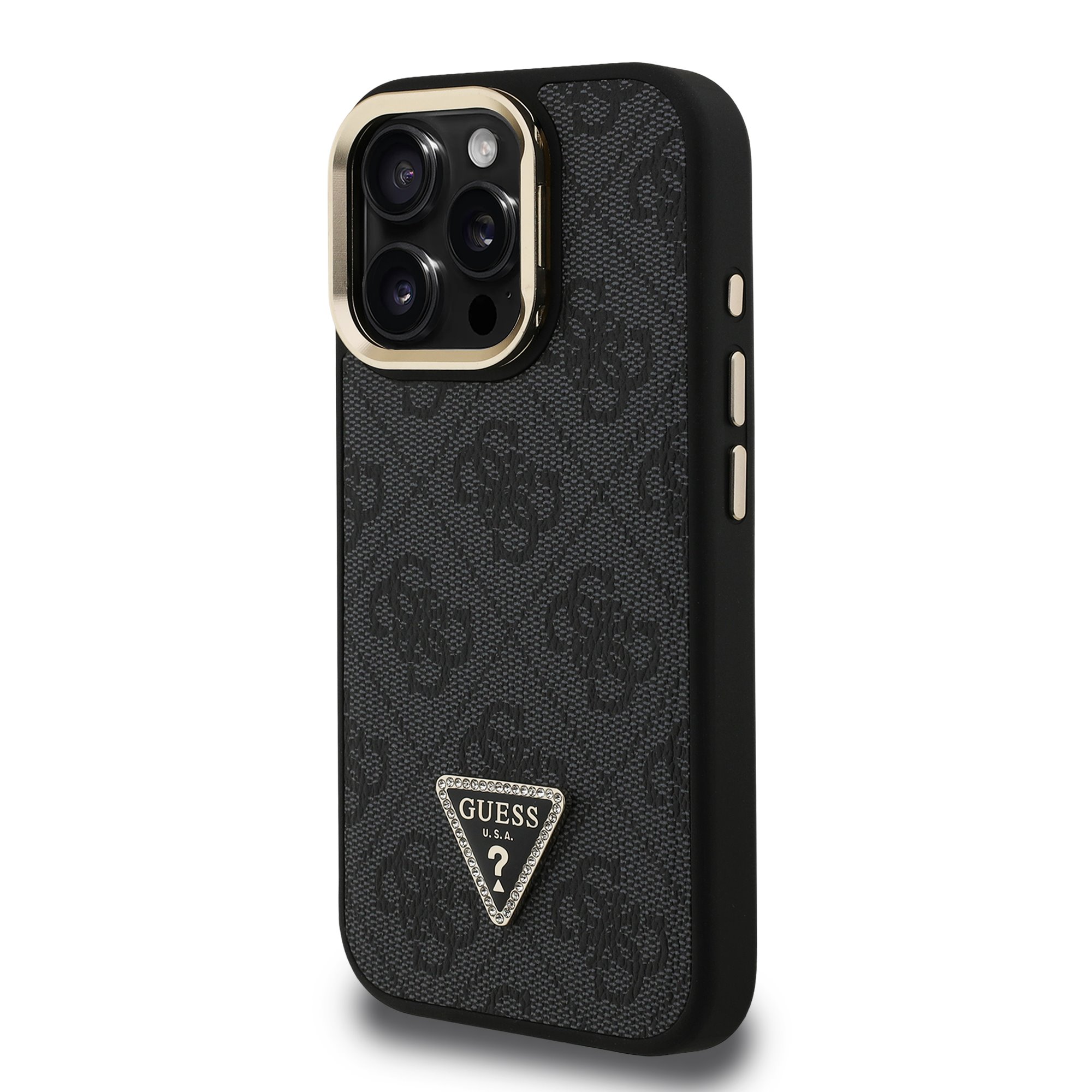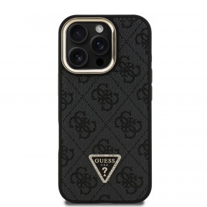 A prémium Guess PU 4G Strass Triangle Logo Állvány Kamera Keret hátlap elegáns, jellegzetes 4G mintázattal rendelkezik, amelyet a GUESS háromszög logó egészít ki.