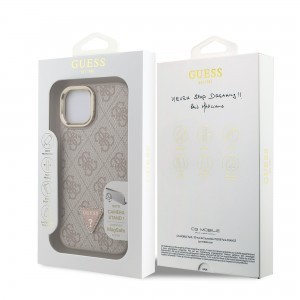 A prémium Guess PU 4G Strass Triangle Logo Stand Kamera Keret hátlap elegáns, jellegzetes 4G mintával rendelkezik, amelyet a háromszög alakú GUESS logó tesz teljessé.