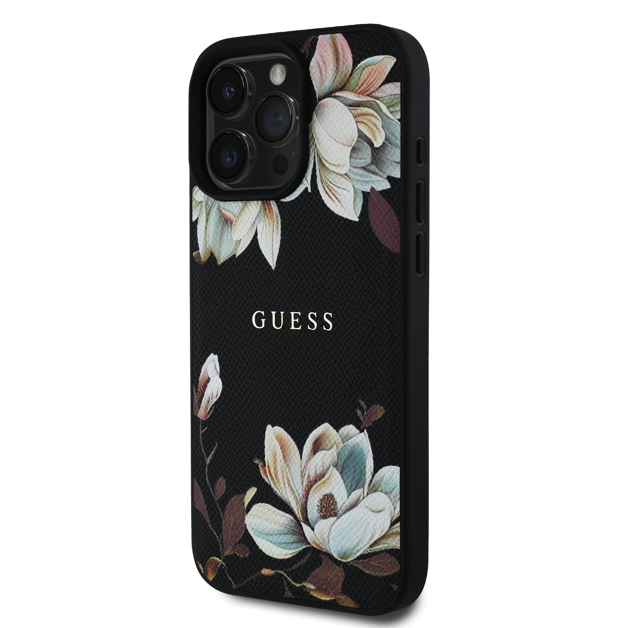 A prémium Guess PU Grained Magnolia MagSafe hátlap elegáns, kifinomult dizájnt kínál virágmotívummal.