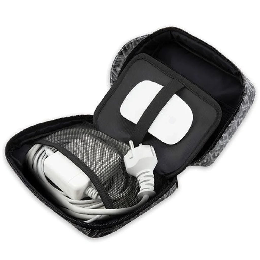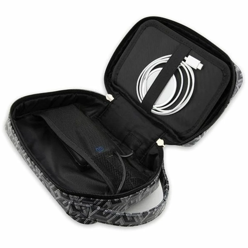 A kivételesen stílusos és ízléses szervező táskák kollekciója azok számára készült, akiknek szükségük van egy kiegészítőre, amely elegendő helyet biztosít a mindennapokban szükséges tárgyak tárolására, miközben divatos megjelenést is akarnak. A Guess divatház által aláírt G Cube kollekció a legmagasabb minőségű kidolgozás garanciája egyedi dizájnnal és tervezői esztétikával. A kollekciót a legmagasabb minőségű G Cube nyomattal díszítették, ami tökéletes javaslat az exkluzív megjelenést és tervezői kiegészítőket értékelők számára. A Guess divatházra jellemző G Cube motívum nagyon keresett minta, amely egyenesen a márka legújabb kollekciójából származik. A táska alsó pántján elhelyezett nagy Guess márkajelzés, amely ellentétben áll a tok többi részével, hangsúlyozza a kollekció elitizmusát, gyönyörű díszítése, és egyben a kiváló minőség és hitelesség megerősítése. A táska belseje rendkívül funkcionális - számos rekesz lehetővé teszi a szükséges kis kiegészítők kényelmes tárolását. A táska külső portja USB csatlakozóval végződik, belsejében pedig egy USB csatlakozóval végződő kábel található. A táska egy nagyon kényelmes, praktikus fogantyúval van ellátva, amely lehetővé teszi, hogy csuklóra akassza vagy kézben tartsa. A terméket Guess licenccel gyártják.