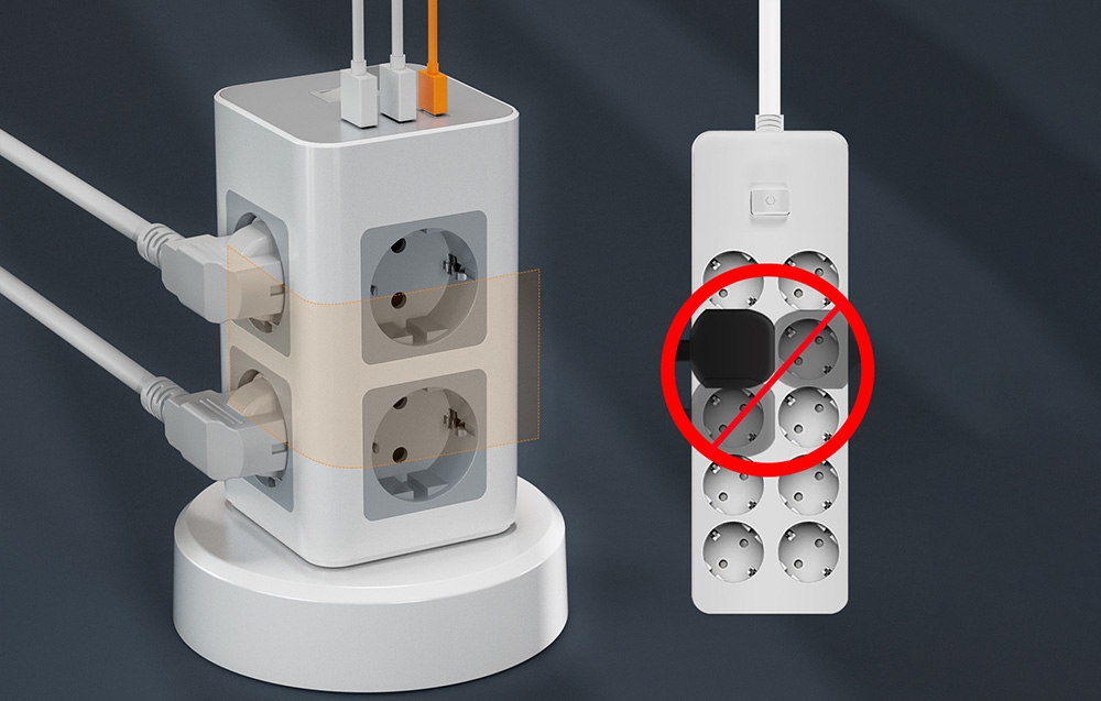 A konnektorok ergonomikus elrendezése: A ház négy oldalán elhelyezett aljzatok elrendezésének alkalmazása megakadályozza, hogy a csatlakozók egymást blokkolják. Ez lehetővé teszi a nagyobb méretű tápegységek kényelmes csatlakoztatását is, így a Tessan hálózati csatlakozó ideális a szűkös helyekkel rendelkező helyiségekben. Ezenkívül a beépített be- és kikapcsoló lehetővé teszi a tápegység gyors kikapcsolását anélkül, hogy a dugót ki kellene húzni az aljzatból.