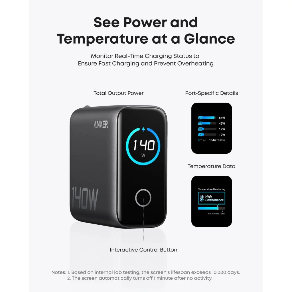 Az Anker Zolo nem csak erős, hanem okos is. Az elegáns, beépített érintőkijelző valós időben mutatja a töltési teljesítményt (W), a hőmérsékletet és az egyes portok státuszát. Így mindig naprakész információval rendelkezhet arról, hogy eszközei éppen hogyan töltődnek, maximális átláthatóságot és kontrollt biztosítva a töltési folyamat felett. Az interaktív vezérlőgombbal könnyedén kezelheti a kijelzőt, amelynek élettartama belső laboratóriumi tesztek alapján meghaladja a 10 000 napot, és 1 perc inaktivitás után automatikusan kikapcsol.