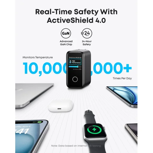 Az Anker Zolo ActiveShield 4.0 biztonsági rendszerrel van felszerelve, amely valós idejű védelmet nyújt. A beépített intelligens GaN chip a hőmérsékletet naponta több mint 10 000 000 alkalommal monitorozza, biztosítva a 24 órás biztonságot és megelőzve a túlmelegedést. Emellett számos beépített biztonsági funkcióval rendelkezik, mint a túlfeszültség és rövidzárlat elleni védelem, amelyek megóvják az Ön értékes eszközeit és magát a töltőt is a károsodástól.