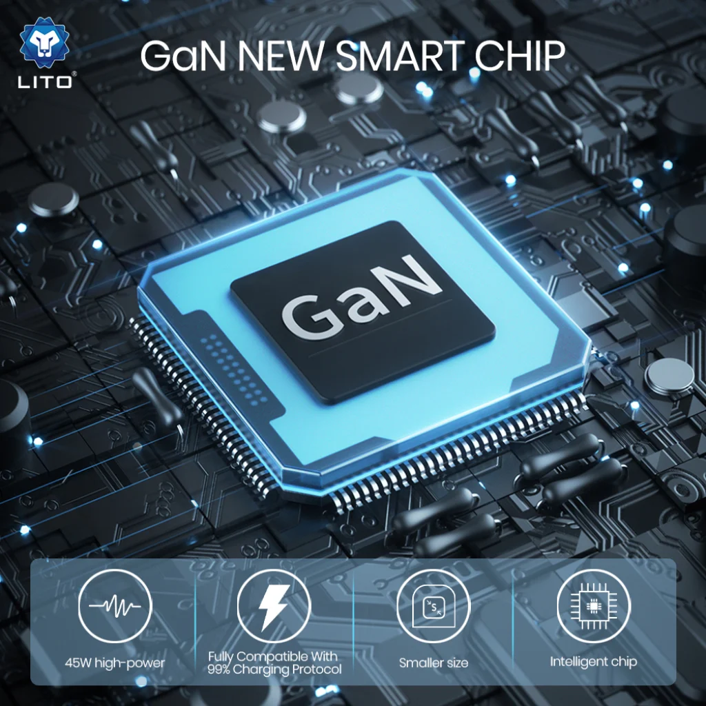 A Lito töltő a forradalmi GaN NEW SMART CHIP technológiát alkalmazza, amely lehetővé teszi a kisebb méret, a nagyobb hatékonyság és a jobb hőkezelés elérését a hagyományos szilícium alapú töltőkhöz képest. Az intelligens chip optimalizálja a töltési folyamatot, garantálva a villámgyorsaságot és a megbízható biztonságot.