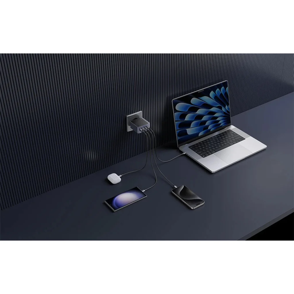 Felejtsd el a dilemmaát, hogy melyik eszközt töltsd először, és búcsúzz el a rendetlenséget okozó, különféle töltőktől! A három USB-C és egy USB-A port segítségével az Ugreen Nexode Air töltő lehetővé teszi, hogy egyszerre akár négy eszközt is energiával láss el, ahogy a mellékelt képek is illusztrálják. Töltsd egyszerre a laptopodat, okostelefonodat, tabletedet és a fülhallgatódat! Ez a sokoldalúság tökéletes társsá teszi az irodában, otthon, utazás közben vagy akár az éjjeli szekrényen, ahol minden fontos eszközöd kéznél lehet feltöltve, egyetlen, kompakt töltővel.