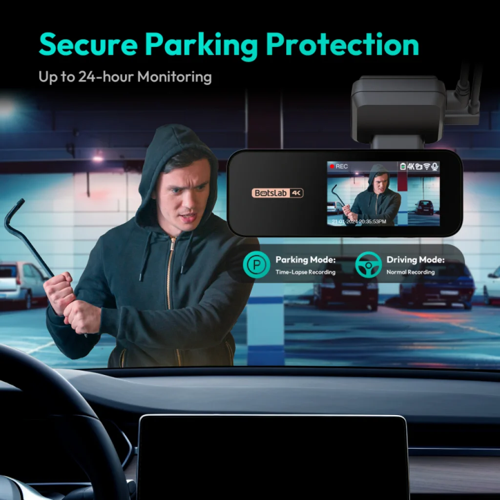 - Időgörgetéses felvétel, amely rögzíti a kulcsfontosságú pillanatokat, amíg autója parkol, így takarítva meg az akkumulátor energiáját, miközben figyeli járművét.