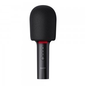 Az ergonomikus kialakítású, elegáns fekete mikrofon tökéletesen illeszkedik a kézbe. A gombok elhelyezése logikus és könnyen hozzáférhető: a bekapcsoló gomb, a hangerő szabályozás és egyéb beállítási lehetőségek (például a vélhetően echo vagy mikrofon érzékenység állítására szolgáló +/- gombok) gyors és egyszerű kezelést tesznek lehetővé. A mikrofon fejrészén található habszivacs szélfogó segít a tiszta hangzás elérésében, minimalizálva a nem kívánt zajokat és a sziszegést. A modern "HAVIT" logó elegánsan díszíti az eszközt, a gondosan elhelyezett LED-ek pedig stílusos és praktikus megjelenést kölcsönöznek.