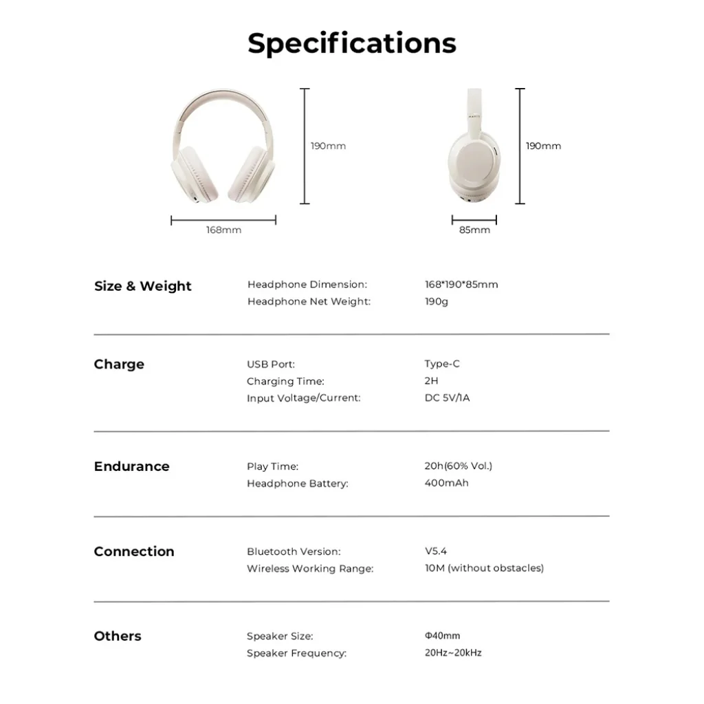 A 400 mAh-s beépített akkumulátorral a Havit H619BT fejhallgató lenyűgöző, akár 20 órás zenehallgatási időt biztosít (60%-os hangerőn). Élvezze kedvenc zenéit megszakítás nélkül egy hosszú utazás vagy egy intenzív munkanap során. Az univerzális Type-C porton keresztül mindössze 2 óra alatt teljesen feltölthető, így gyorsan visszatérhet a zenehallgatáshoz.
