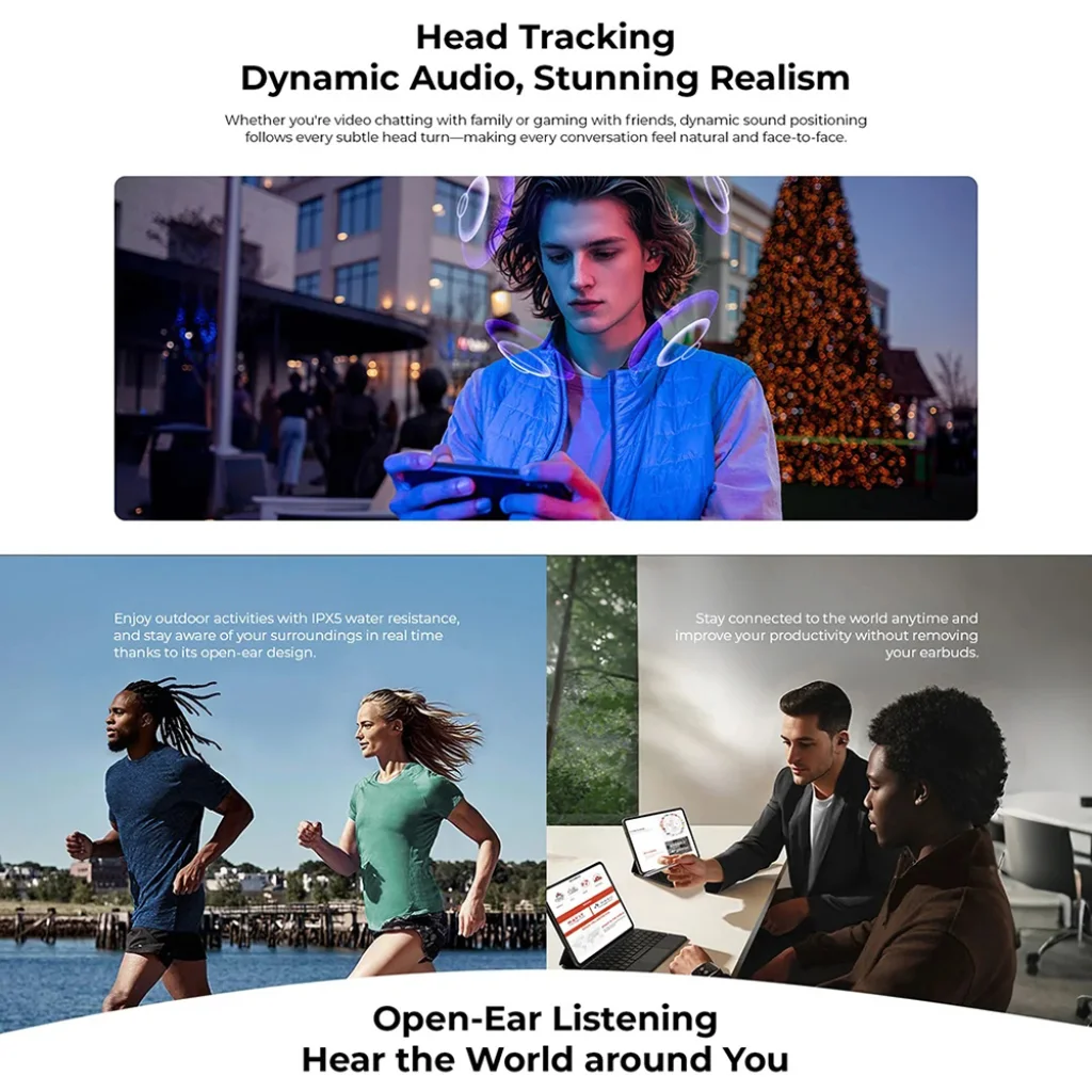 A dinamikus fejkövetés funkció valósághű hangzást biztosít, különösen videóbeszélgetések vagy játék közben. A hang pozíciója követi minden apró fejmozdulatát, így minden beszélgetés természetesnek és személyesnek érződik.