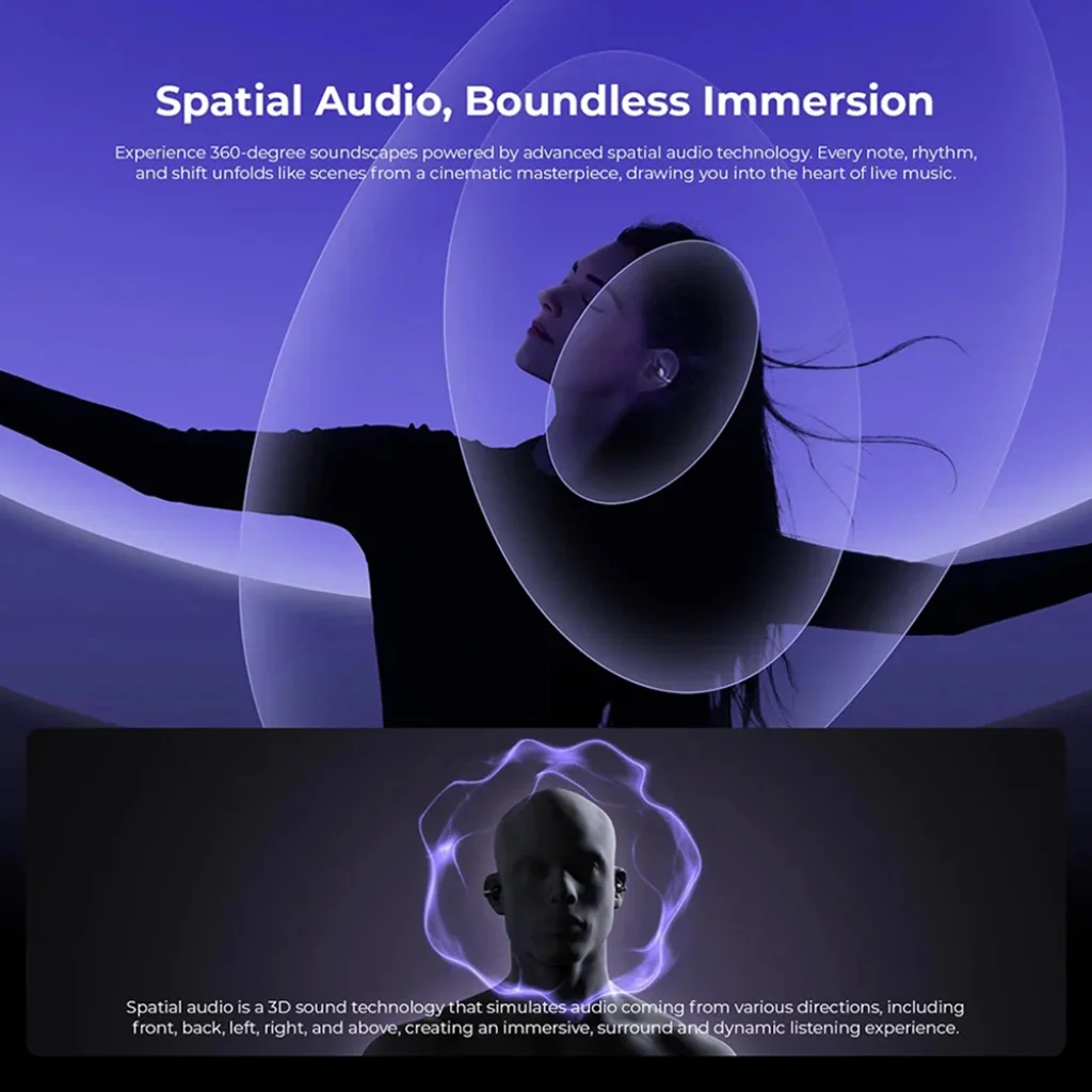 Merüljön el a 360 fokos, élethű hangzásban, amelyet a fejlett térbeli audió technológia biztosít. Minden hang, ritmus és árnyalat úgy bontakozik ki, mint egy filmes mestermű, közvetlenül a zene vagy a tartalom szívébe vonzva Önt. A 3D hangzásélmény a hangokat különböző irányokból, elölről, hátulról, balról, jobbról és felülről szimulálja, páratlanul magával ragadó és dinamikus hallgatási élményt nyújtva.