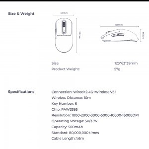 - Csatlakozás: Vezetékes (USB-C), 2.4G vezeték nélküli, Bluetooth V5.1