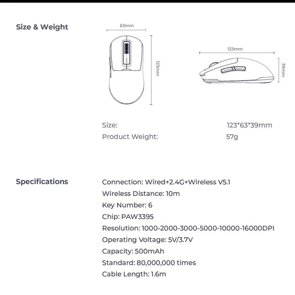 Az 500mAh-s beépített akkumulátor gondoskodik a hosszan tartó vezeték nélküli üzemidőről, így megszakítás nélkül élvezheted a játékot. Ha pedig lemerülne, a mellékelt 1.6 méteres, fonott USB-C kábellel gyorsan feltöltheted, miközben továbbra is vezetékes egérként használhatod. A strapabíró kapcsolók 80 millió kattintásos élettartammal büszkélkedhetnek, biztosítva a hosszú távú megbízhatóságot.