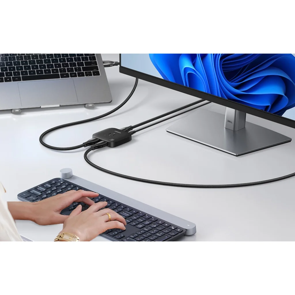 A készülék 2x1-es üzemmódban működik, ami azt jelenti, hogy két jelforrást csatlakoztathatsz egy kijelzőhöz. A váltás manuálisan történik egyetlen gombbal. Az eszköz USB-C portot használ tápellátásra, közvetlenül csatlakoztatható a legtöbb töltőhöz, tévékészülékek USB-portjaihoz vagy számítógéphez. LED-ek jelzik, hogy melyik eszköz aktív.