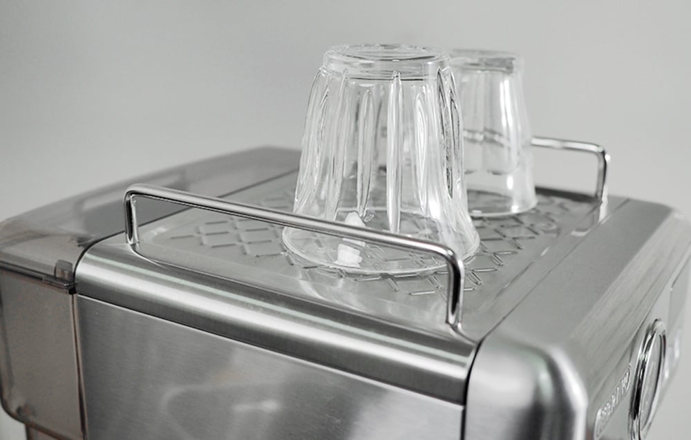 A kávéfőző rozsdamentes acélból készült, ami garantálja a tartósságot és az elegáns megjelenést. A praktikus fűtött csészetálca megfelelő hőmérsékleten tartja az ételeket, az átlátszó 1,8 literes víztartály pedig megkönnyíti a vízszint ellenőrzését. A szintjelzővel ellátott, kivehető csepptálca megakadályozza a túltöltést. Másrészt a szállítófogantyúnak köszönhetően a készülék könnyen szállítható.