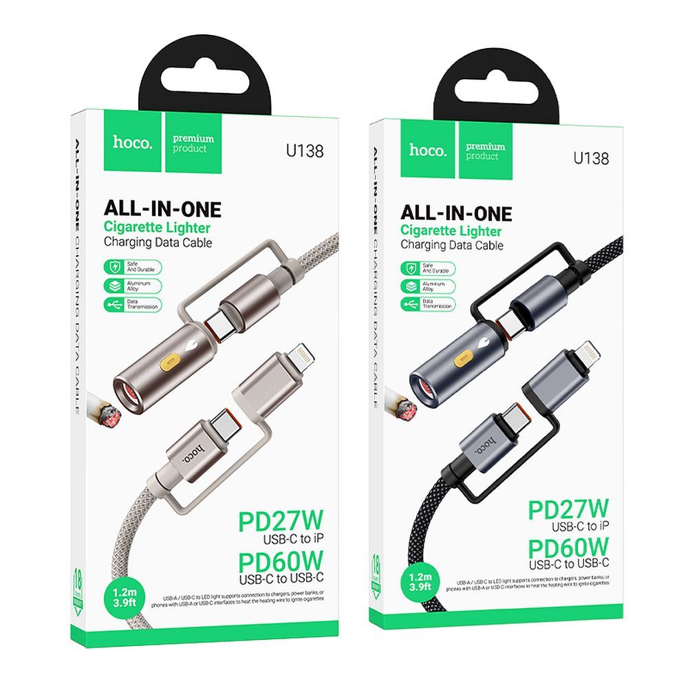 Gyors töltésű USB-C / Lightning - USB-C kábel autós szivargyújtóval a Hoco-tól. Lehetővé teszi a gyors töltést akár 60 W-ig és az adatátvitelt. Támogatja a Power Delivery és Quick Charge 3.0 protokollokat. Töltsd gyorsan még a nagyobb eszközöket is! A kábel kompatibilis a Power Delivery és Quick Charge 3.0 protokollokkal, így sok különböző eszközt képes táplálni akár 60 W teljesítményigényig. A gyors töltés azt jelenti, hogy a telefonod (vagy más eszközöd) akkumulátorát gyorsan teljes kapacitásra töltheted. Első a biztonság: a kábel csatlakozóinak hőmérséklete állandó szinten marad, így nem kell a túlmelegedéstől és az akkumulátor károsodásától tartanod – még akkor sem, ha használod az eszközt töltés közben. Az USB-C és Lightning interfészekkel való kompatibilitásának köszönhetően lehetővé teszi a fűtőelem felmelegítését, hogy cigarettát gyújthass különböző forrásokból, például okostelefonokból, hálózati töltőkből vagy power bankokból. A nyílt láng hiánya biztonságossá és kényelmes használatúvá teszi az eszközt, ideális megoldást nyújtva minden helyzetben. A hosszú 1,2 m-es kábel biztosítja a kényelmes okostelefon-használatot töltés közben. Magas minőségű alumínium ötvözetből és fonott huzalból készült, a kábel ellenáll a mindennapi használatnak és hosszú élettartamot biztosít. Specifikáció:
