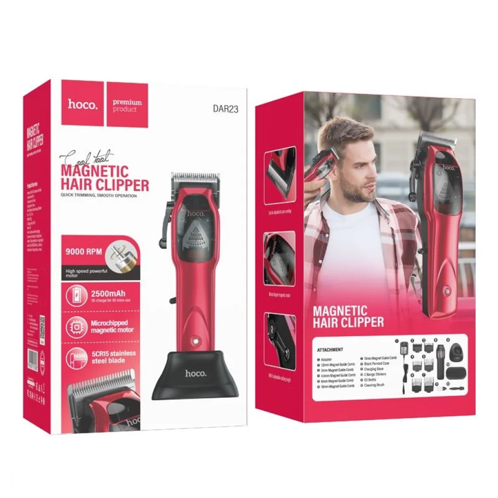 A Hoco DAR23 hajvágó megbízható hajvágó eszköz, melyet precizitás és kényelem szem előtt tartásával terveztek. Kiváló minőségű 5CR15 acél pengével van felszerelve, amely sima és precíz vágást tesz lehetővé mind a ritkítás, mind a kontúrozás során. A modern 9 000 RPM-es motor biztosítja a zökkenőmentes, akadálymentes működést. A hajvágó állítható fémcsúszkával (4 szint), tartós kapcsolóval és elegáns UV házzal rendelkezik, amely átlátszó ablakkal van ellátva. A 2500 mAh-s akkumulátor 90 perces üzemidőt garantál 3 órás töltés után. A készlet tartalmaz 6 mágneses tartozékot, egy további burkolatot, egy VDE-tanúsítvánnyal rendelkező adaptert és más, az eszköz karbantartásához szükséges tartozékokat. Főbb jellemzők: