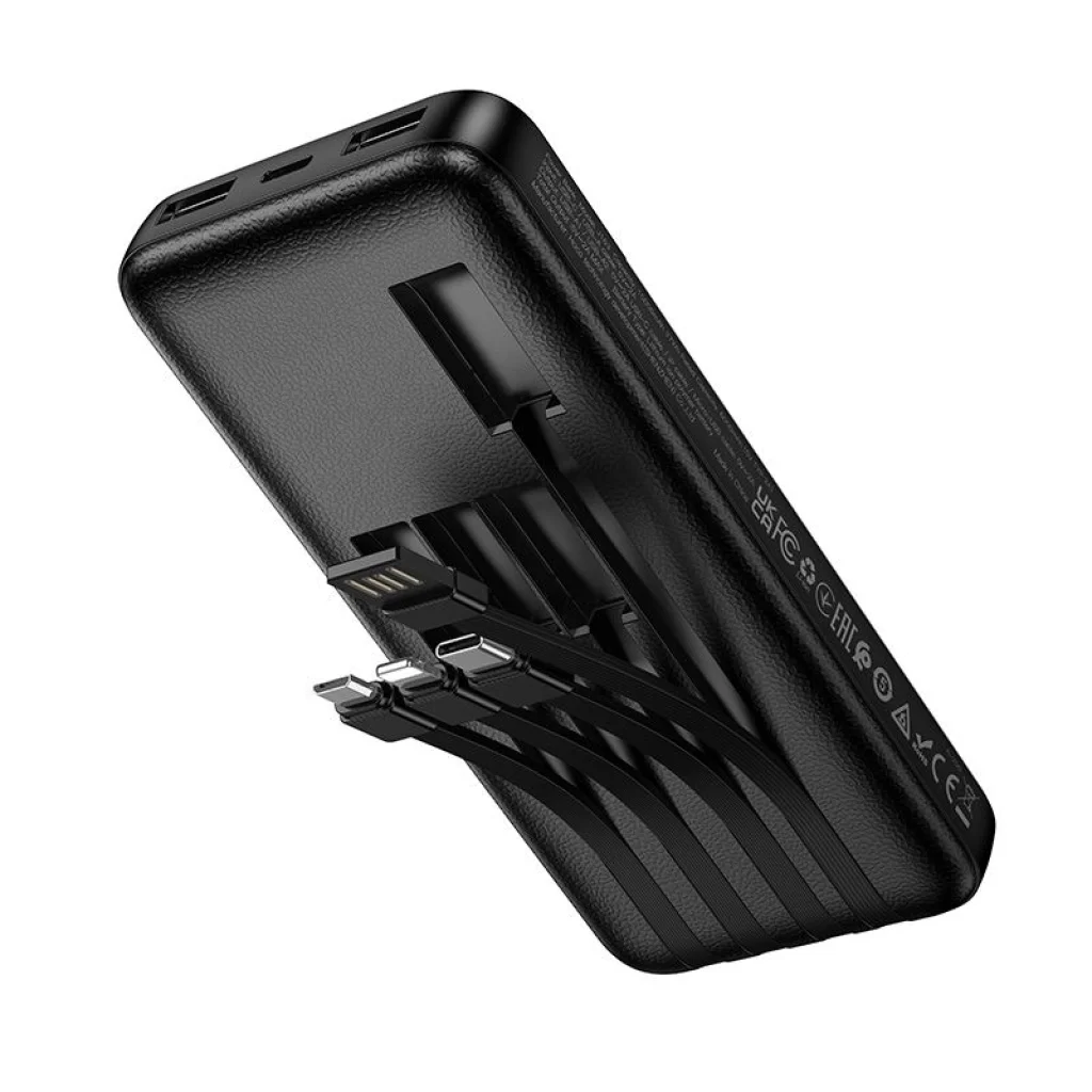 A Hoco J163 10000 mAh kapacitású powerbank praktikus áramforrás, amely négy beépített kábellel van felszerelve: USB-A, USB-C, Lightning és Micro USB. A modellt kényelmes, mindennapi használatra tervezték, így nincs szükség külön kábelek hordozására – két USB-A kimeneti portot kínál az eszközök töltéséhez, dedikált bemeneteket a powerbank töltéséhez, LED-es töltöttségjelzőt, valamint kompakt kialakítást otthoni, munkahelyi és utazási használatra. Az eszközök töltésére szolgáló kimeneti portok és beépített kábelek a következők: USB-A1, USB-A2, beépített USB-C kábel, beépített Lightning kábel és beépített Micro USB kábel. Mindegyik kimenet 5V / 2A teljesítménnyel működik, így a powerbank alkalmas okostelefonok, fülhallgatók, okosórák és más mobileszközök töltésére. A powerbank töltésére szolgáló bemenetek a USB-C és a beépített USB-A kábel, mindkettő 5V / 2A támogatással. Ennek köszönhetően a powerbank két kényelmes módon is feltölthető, külön kábel használata nélkül. A névleges kapacitás 6000 mAh, amely elegendő egy telefon vagy más mindennap használt eszköz hatékony újratöltéséhez. A LED kijelző mutatja az akkumulátor töltöttségi szintjét, így könnyen nyomon követhető, mikor kell újratölteni a powerbankot. A lángálló PC + ABS burkolat növeli a tartósságot, míg a beépített lítium-polimer cella stabil működést biztosít. Az integrált kábelek növelik a kényelmet, és csökkentik a külön töltőkábelek hordozásának szükségességét. Specifikáció: