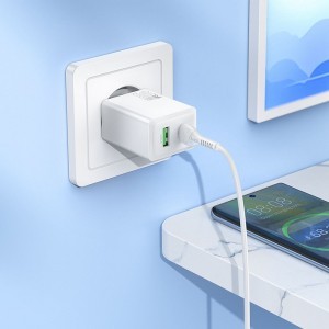 A Hoco N71 hálózati töltő gyors töltési funkcióval és kettős kimenettel rendelkezik. Lehetőséget biztosít mobil eszközök gyors töltésére. A töltő kettős kimenettel van felszerelve: USB-C (30 W) és USB-A (18 W), ami lehetővé teszi, hogy egyszerre 2 eszközt töltsön. A termék támogatja a gyors töltési megoldásokat, mint a PD, QC 3.0, FCP, AFC és mások. PC anyagból készült, a töltő rendkívül tartós és ellenálló a sérülésekkel szemben. Az intelligens felismerő rendszer lehetővé teszi, hogy az áramot az adott eszközhöz igazítsa, biztosítva a biztonságos használatot. Specifikáció: Portok: USB-C, USB-A Teljes kimeneti teljesítmény: 5 V / 3 A Teljesítmény: - USB-C 30 W (PD, QC 3.0, FCP, AFC) - USB-A 18 W (QC 3.0, FCP, AFC) Anyag: PC (tűzálló) Kábel: nincs Dugó: EU Méret: 83 x 39.5 x 26.5 mm Súly: 70 g Technológia támogatja a gyors töltést: PD, QC 3.0, FCP, AFC