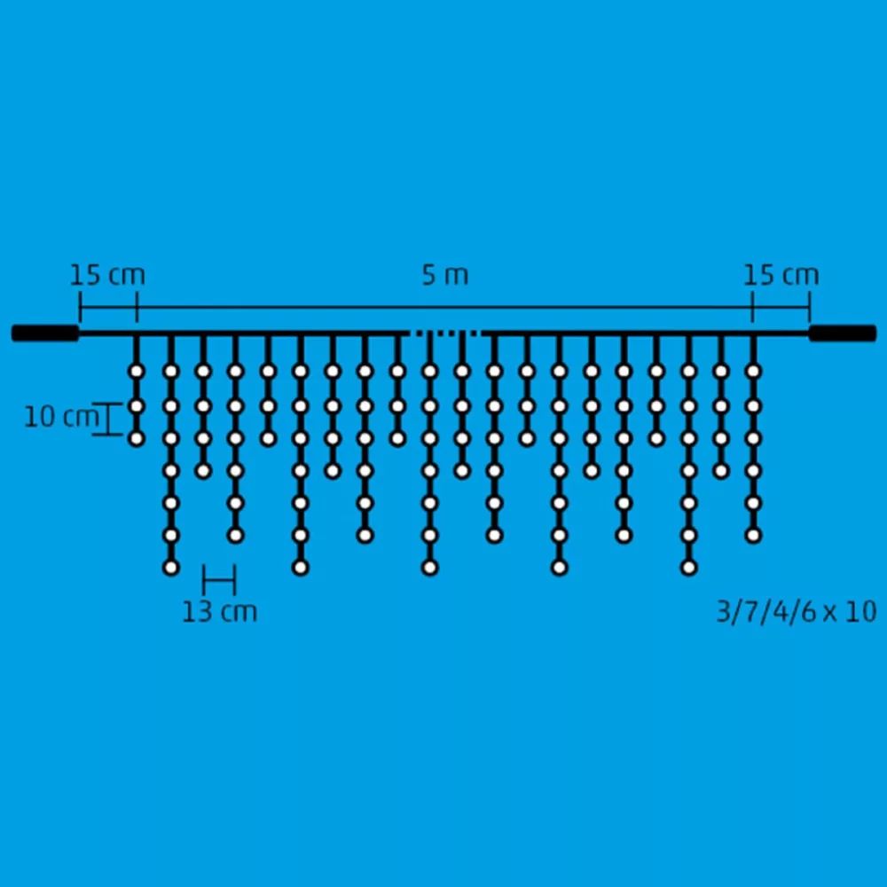 Ez a 5 méteres fényfüggöny 200 melegfehér LED-del rendelkezik, amelyek gyönyörű, tiszta fényt biztosítanak, ezzel varázsolva egyedi hangulatot bármely környezetbe. Az állófényű LED-ek egyenletesen oszlanak el a 3/7/4/6 füzérekből álló, 10 csoportos rendszerben, amely látványos, mégis harmonikus megjelenést eredményez. A fehér vezeték kiválóan illeszkedik a különféle környezetekbe, legyen szó beltéri karácsonyi díszítésről vagy kültéri fénydekorációról.
