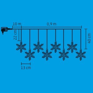 Ez a lenyűgöző fényfüggöny 8 akril hókristályból áll, mindegyikben egy-egy melegfehér LED világít, így a fények finoman csillognak, akár a frissen hullott hó. Az átlátszó vezetékkel rendelkező fényfüggöny diszkréten olvad bele bármilyen környezetbe, biztosítva, hogy a figyelem a csillogó hókristályokra összpontosuljon.