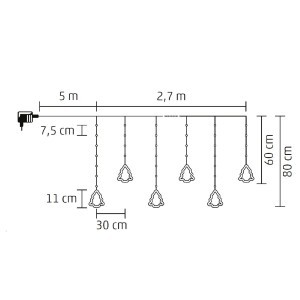 A fényfüggöny világítási módja állandó, így folyamatos meleg fényárban úszik. A 2,7 méter hosszú füzért 5 méteres tápkábel követi az adapterig, amely IP44-es kültéri védelemmel rendelkezik, biztosítva a biztonságos használatot bármilyen időjárási körülmények között. A füzérek közti távolság 30 cm, míg a fenyő figura magassága 11 cm. A gerinctől a lelógások hossza a figurák aljáig 60 cm és 80 cm, ami lenyűgöző látványt nyújt.