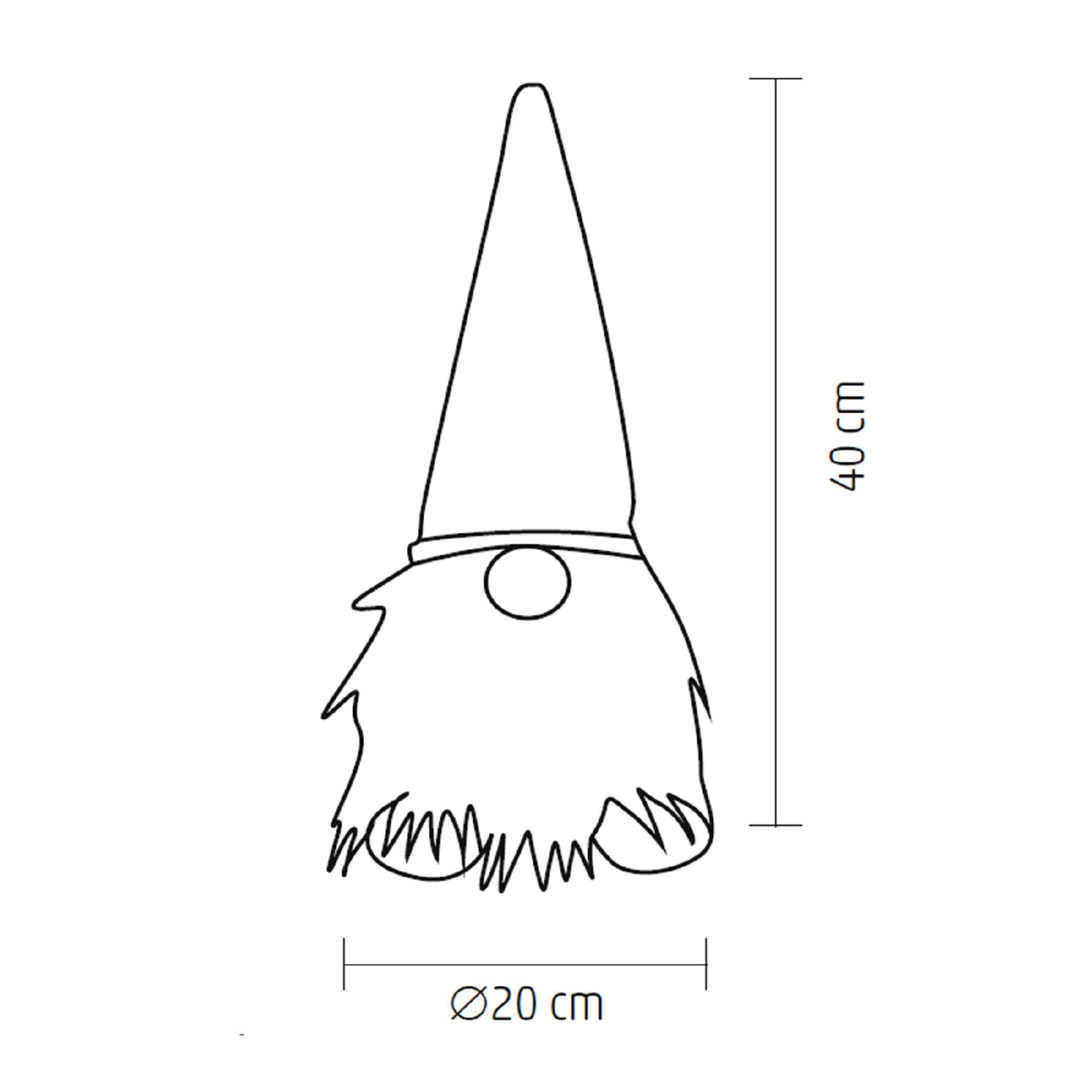 A termék tápellátását 3 darab 1,5V-os AA elem biztosítja (nem tartozék), amely szabad mozgathatóságot és vezetékmentes használatot tesz lehetővé. A 20 x 20 x 40 cm-es méretű ülő manó minden helyiségben mutatós, akár a nappaliban, akár a hálószobában helyezi el.