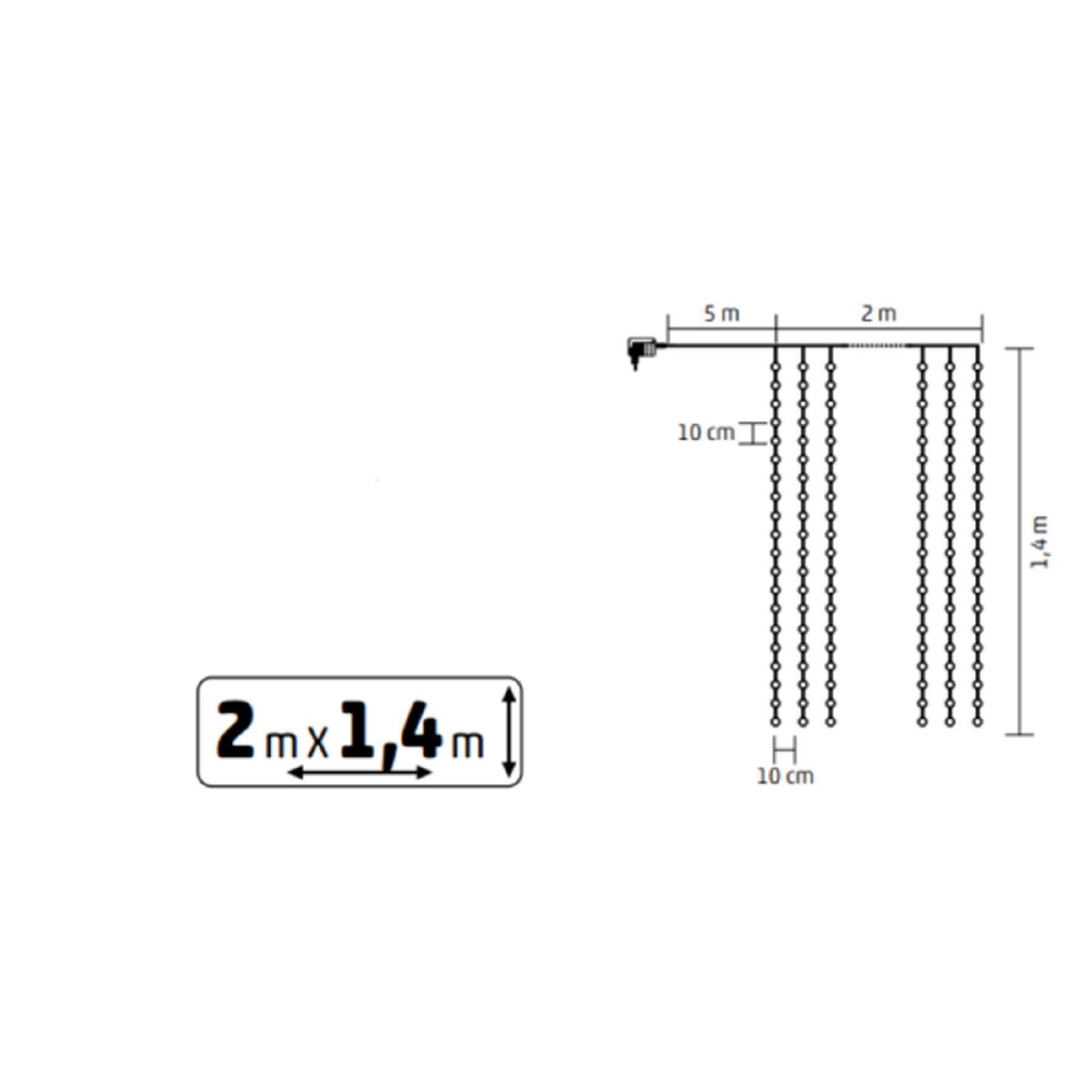 A termék 21 füzérből áll, melyek mindegyike 14 darab DOT LED-et tartalmaz. Ezek egyenletesen helyezkednek el a 2 méter széles és 1,4 méter magas függönyön, így ideálisan kitöltenek nagyobb felületeket is – legyen az egy utcafronti ablak, teraszkorlát vagy beltéri falrész. A melegfehér fény meleg, elegáns megjelenést kölcsönöz a dekorációnak, miközben nem túl harsány, így bármilyen környezetbe könnyedén illeszkedik.