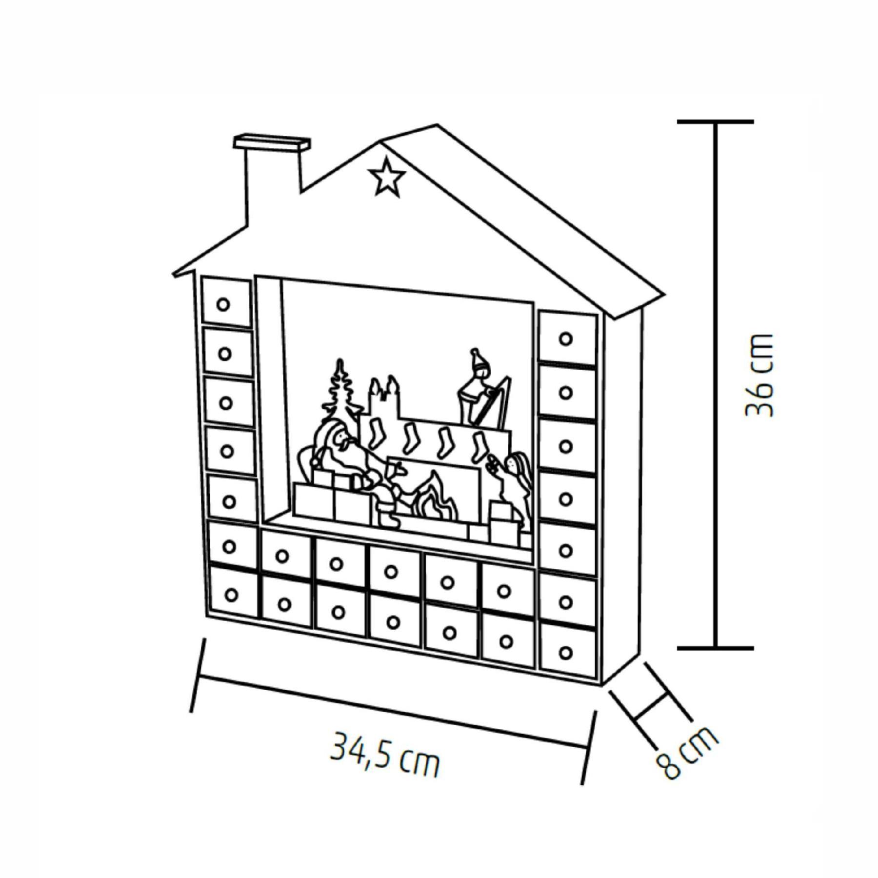 A naptár masszív MDF és PVC anyagból készült, így hosszú távon is megőrzi formáját és minőségét. 10 db melegfehér LED gondoskodik a kellemes fényhatásról, amely szolid ragyogással tölti be a helyiséget, anélkül hogy zavaróan erős lenne. Ez az adventi dekoráció nemcsak praktikus, hanem kifejezetten esztétikus is – otthonos hangulatot áraszt nappaliban, előszobában vagy akár gyerekszobában is.