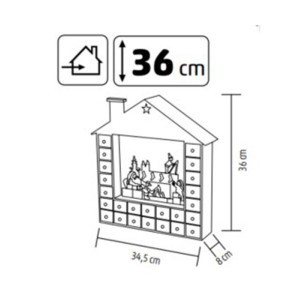 A 34,5 × 8 × 36 cm-es méret ideális a polcra, komódra vagy asztalra helyezve, anélkül hogy sok helyet foglalna. A LED világítás 2 db AAA elemmel működik (az elemek nem tartozékok), így a naptár bárhol könnyen elhelyezhető – nincs szükség konnektorra vagy kábelekre. Az elemes tápellátásnak köszönhetően biztonságos és mobilis használatot biztosít, különösen kisgyermekes otthonokban.