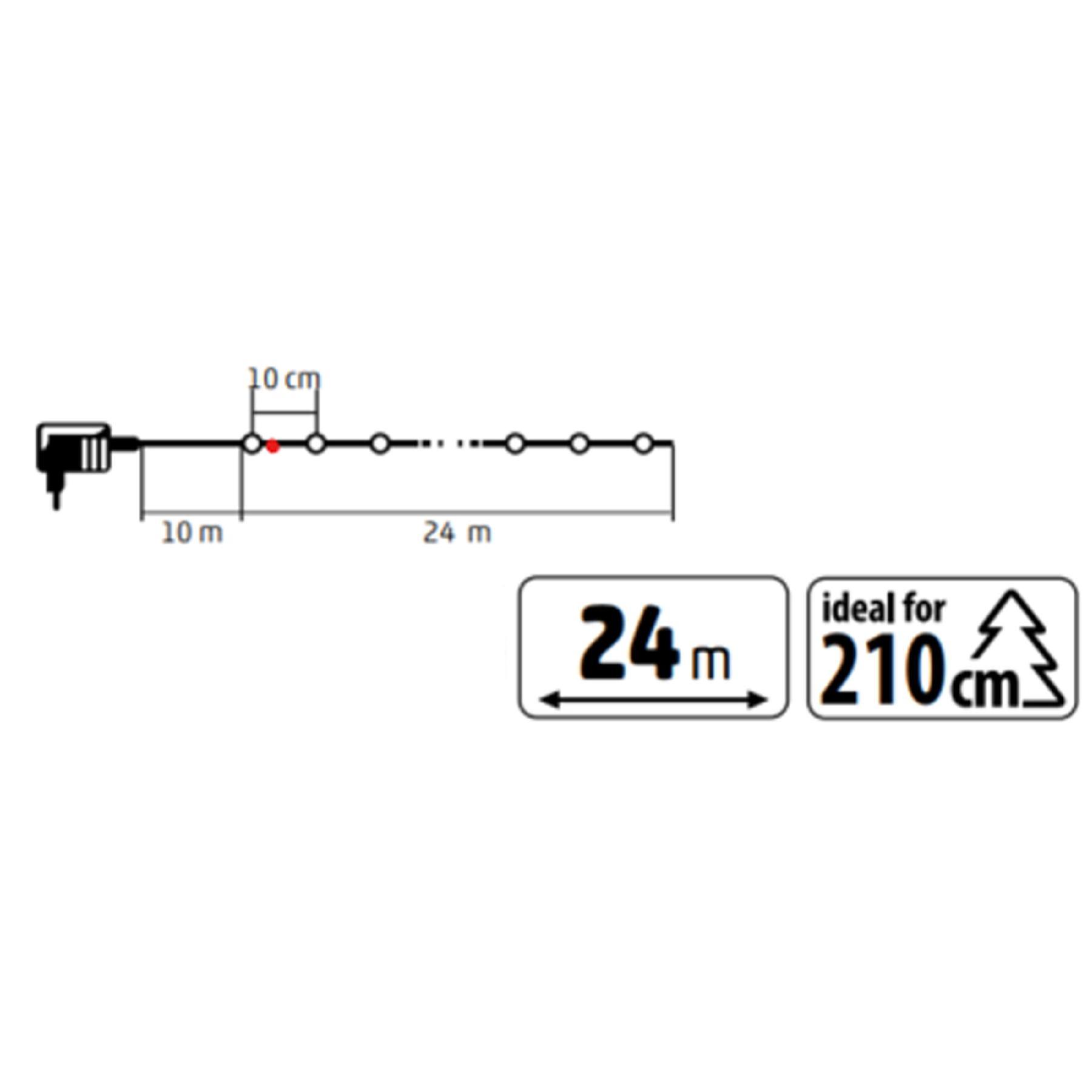 A fényfüzér teljes hossza 23,9 méter, amelyen 240 darab melegfehér LED gondoskodik az egyenletes fényeloszlásról. A LED-ek 10 cm-es távolságban helyezkednek el egymástól, így a világítás sűrű, mégsem zavaró – ideális fa, erkélykorlát, kerítés vagy akár beltéri falak díszítésére is. A füzérhez tartozik egy 10 méter hosszú tápvezeték, amely lehetővé teszi a rugalmas és praktikus elhelyezést még távolabb eső csatlakozási pont esetén is.