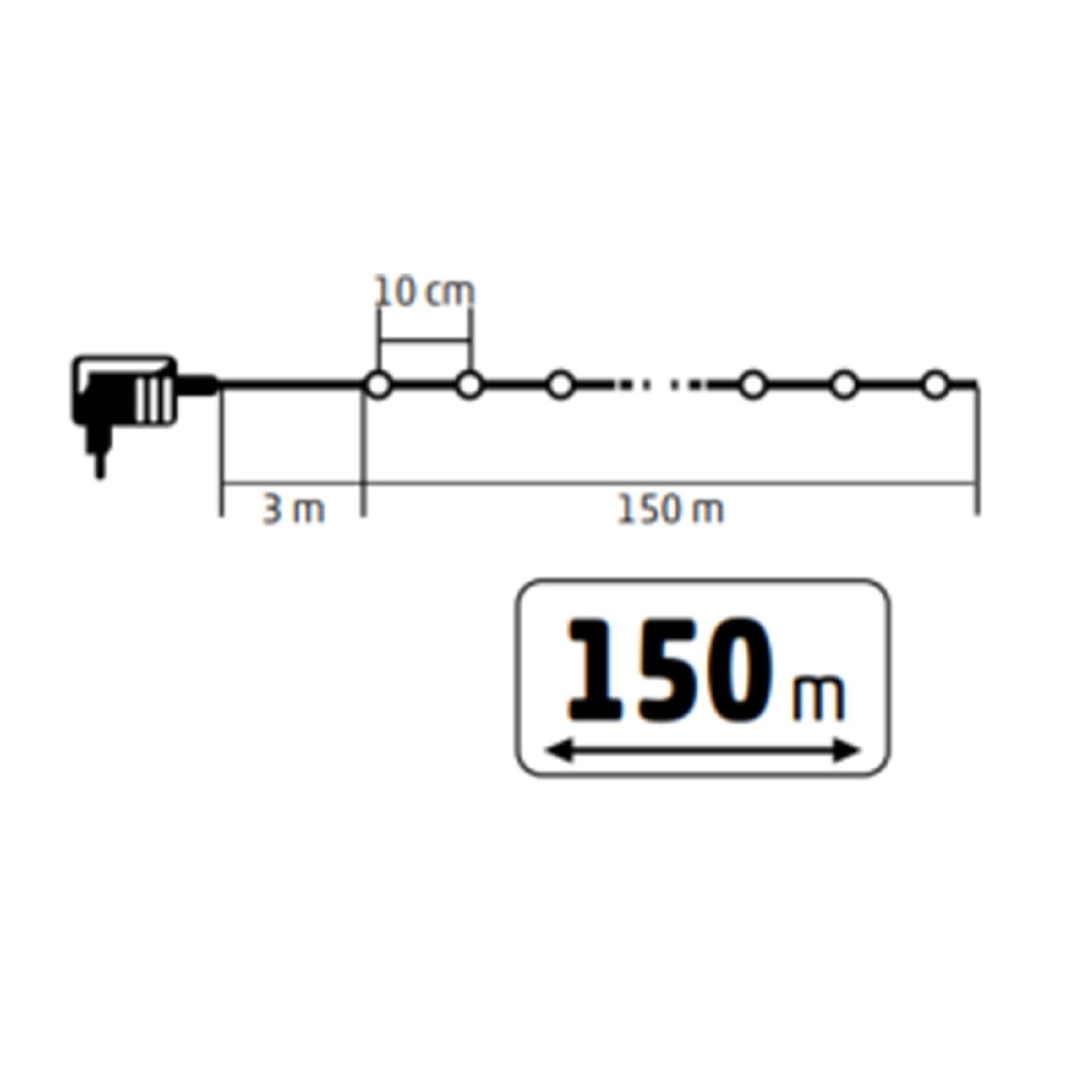 Kül- és beltérre. 150 méter hosszban, 1500 melegfehér microLED-del a vékony, sötétzöld rézvezetéken – a fény látványos, a kábel alig látszik. Nem ígér csodát: stabil fény, pontos vezérléssel.