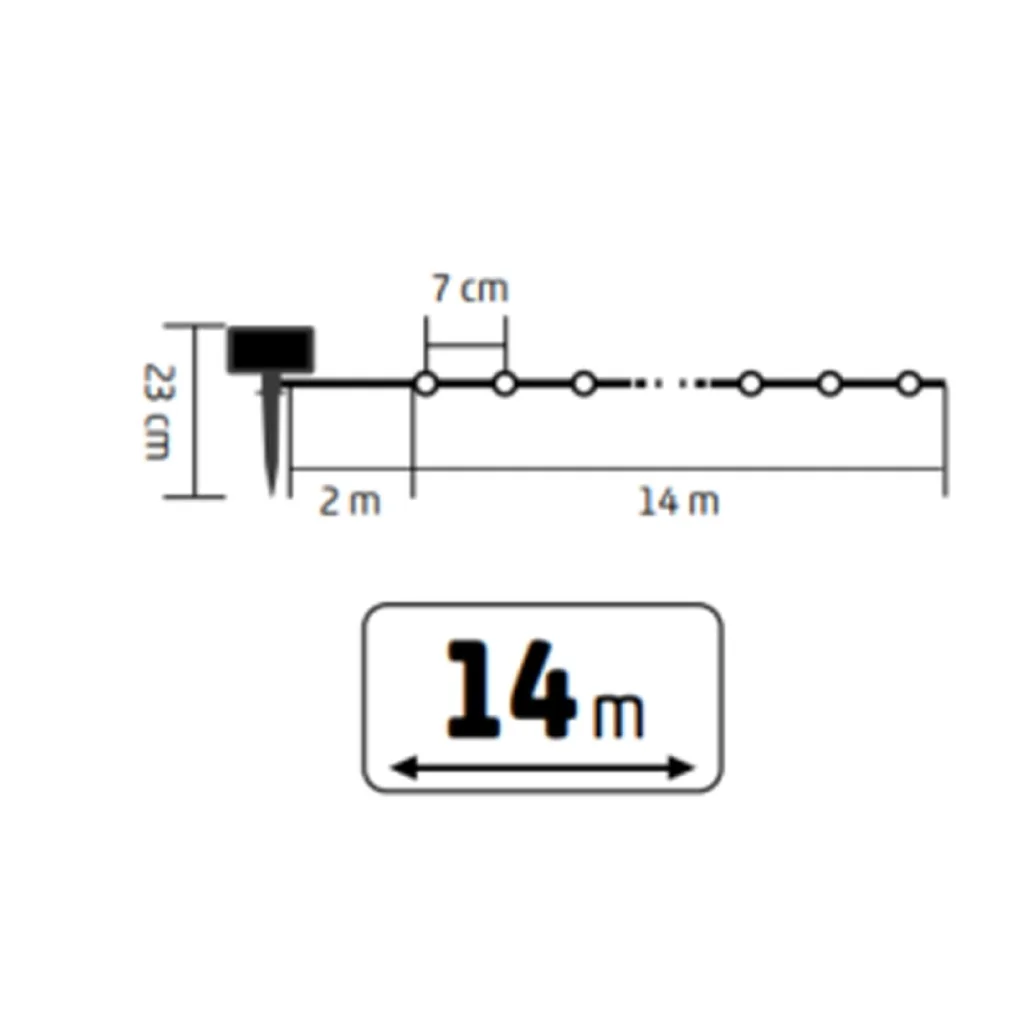 A fényfüzér 200 darab hidegfehér LED-del rendelkezik, amelyek 7 cm-es távolságban helyezkednek el a 14 méter hosszúságú zöld vezetéken. Ez az árnyalat tökéletesen illeszkedik a természetes környezethez, legyen szó bokrokról, kerítésről vagy pergoláról. A 2 méter hosszúságú tápkábel lehetővé teszi a szolár panel optimális elhelyezését a napos területen, így biztosítva a maximális töltést és működést.