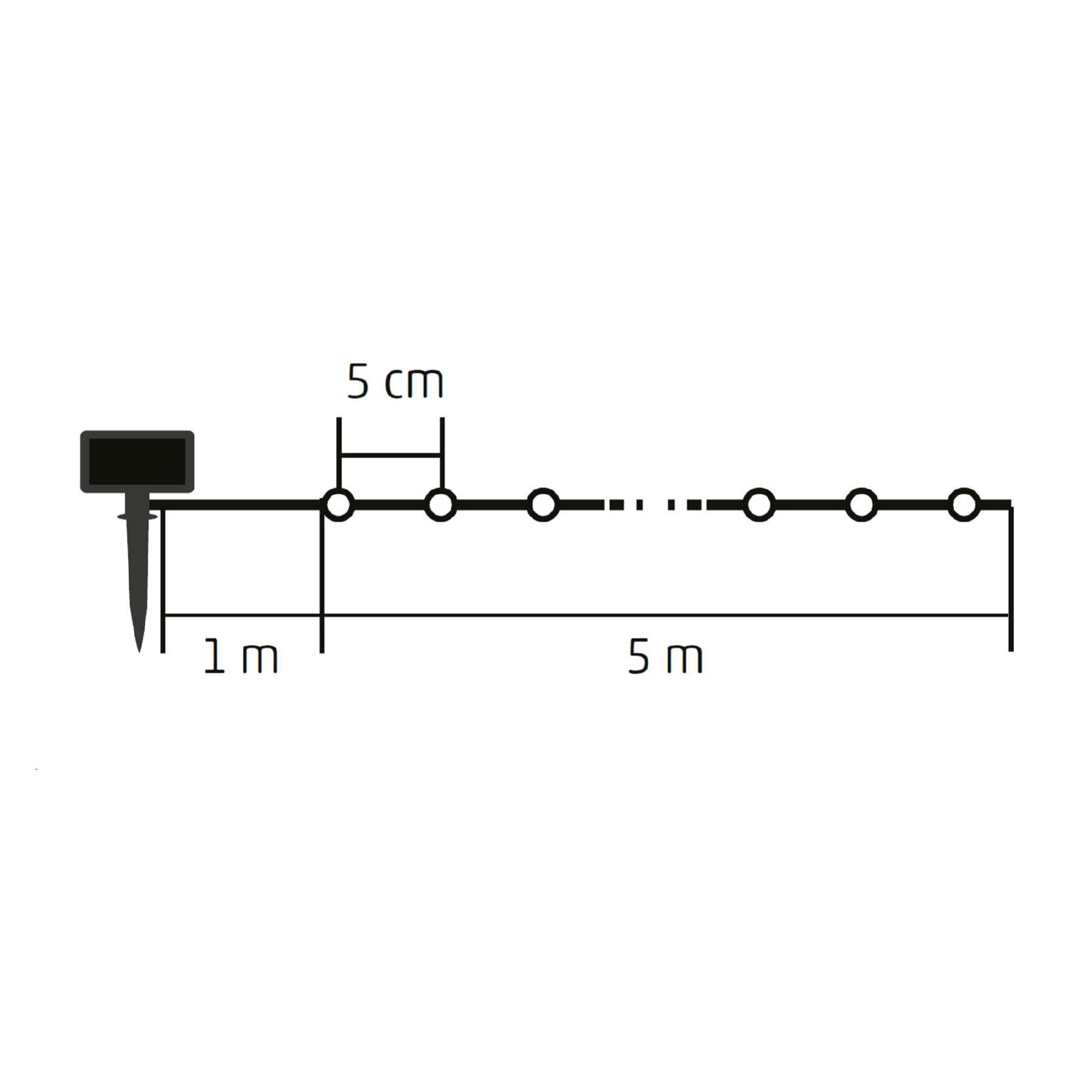 Az átlátszó vezeték diszkrét megjelenést biztosít, így a LED-ek ragyogása kerül a középpontba. A fényfüzér 5 méter hosszú, melyet további 1 méter tápkábel követ a szolár panelig, biztosítva a megfelelő elhelyezést. Az LED-ek közötti 5 cm-es távolság egyenletes fényeloszlást garantál.