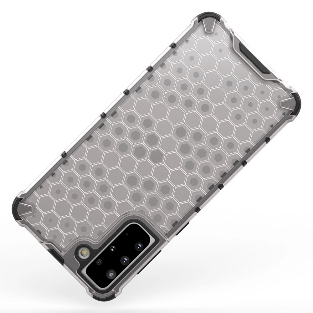 - Megerősített peremvédelem – Megőrzi a képernyő és kamera védelmét sík felületen.