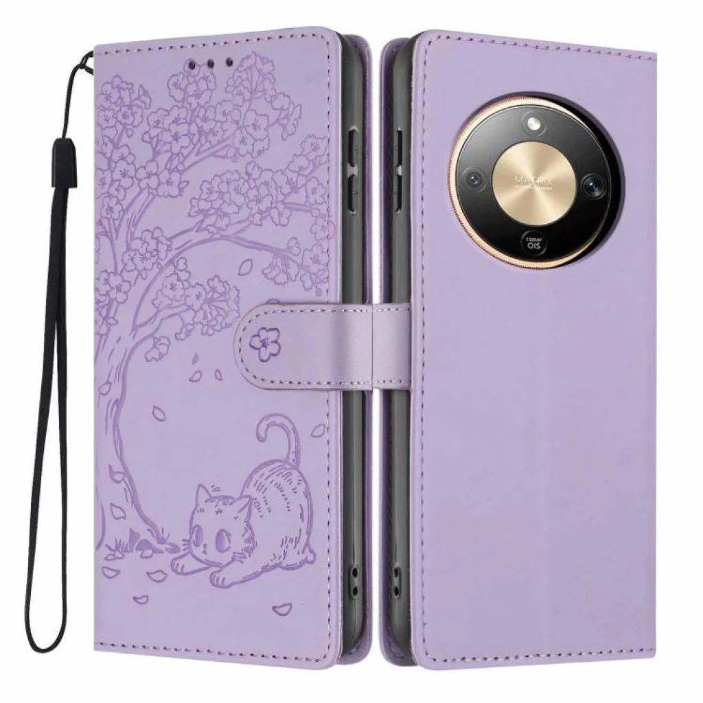 Védje Honor Magic8 Lite telefonját stílusosan és praktikus eleganciával ezzel a lenyűgöző lila vegán bőr flip tokkal. A tok nem csupán kiváló védelmet biztosít, hanem egyedi, dombornyomott fa és játékos macska mintázatával is elvarázsolja a tekintetet, cseresznyevirágokkal gazdagítva a dizájnt.
