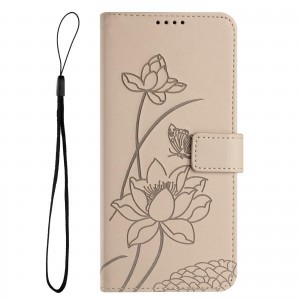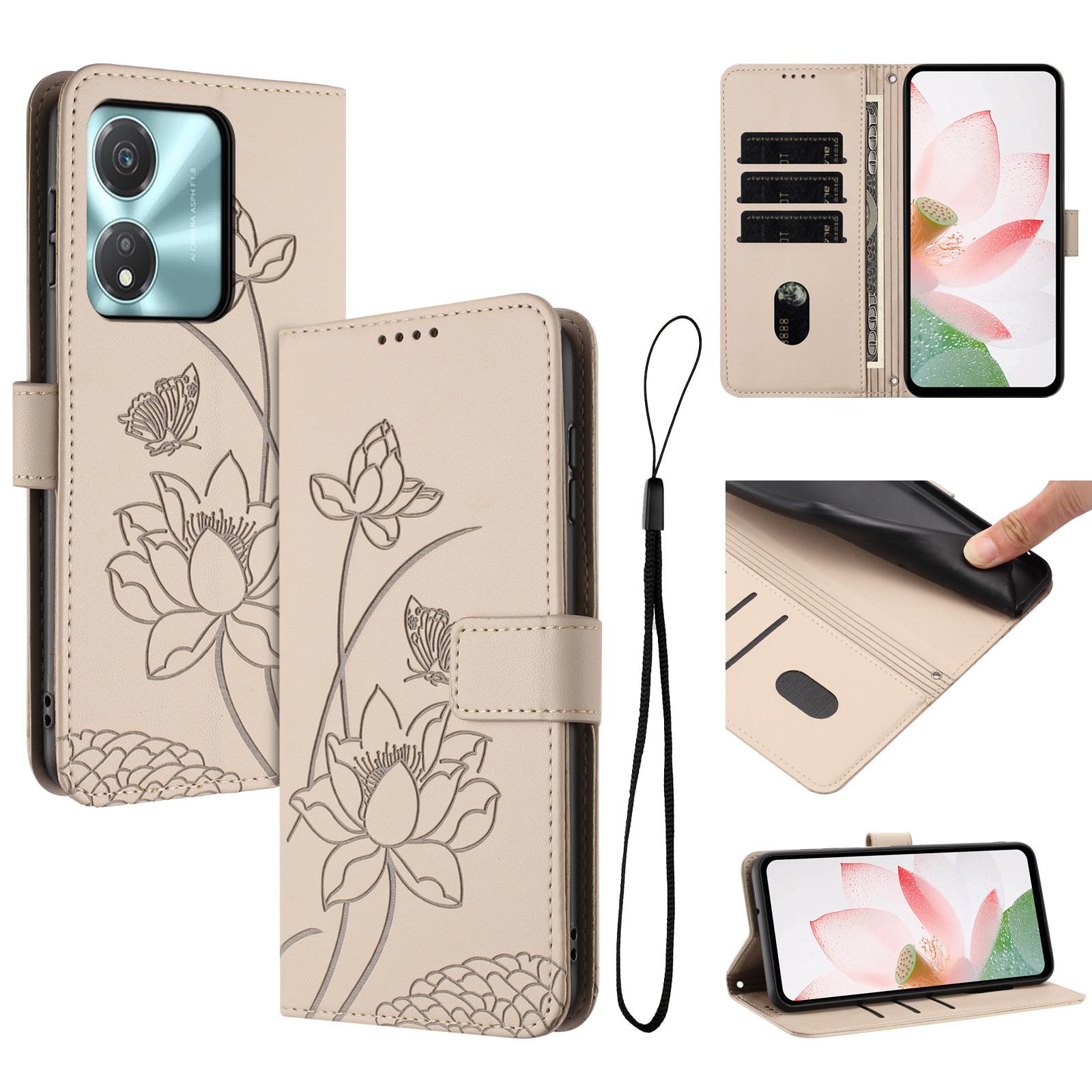 Honor X5c Plus – Lótusz mintás, dombornyomott műbőr telefontok, fliptok nyakpánttal, bézs