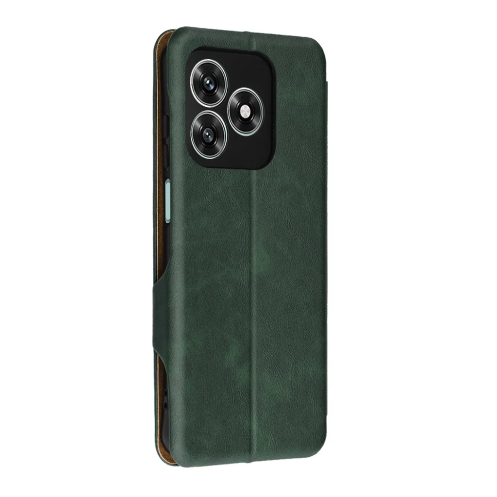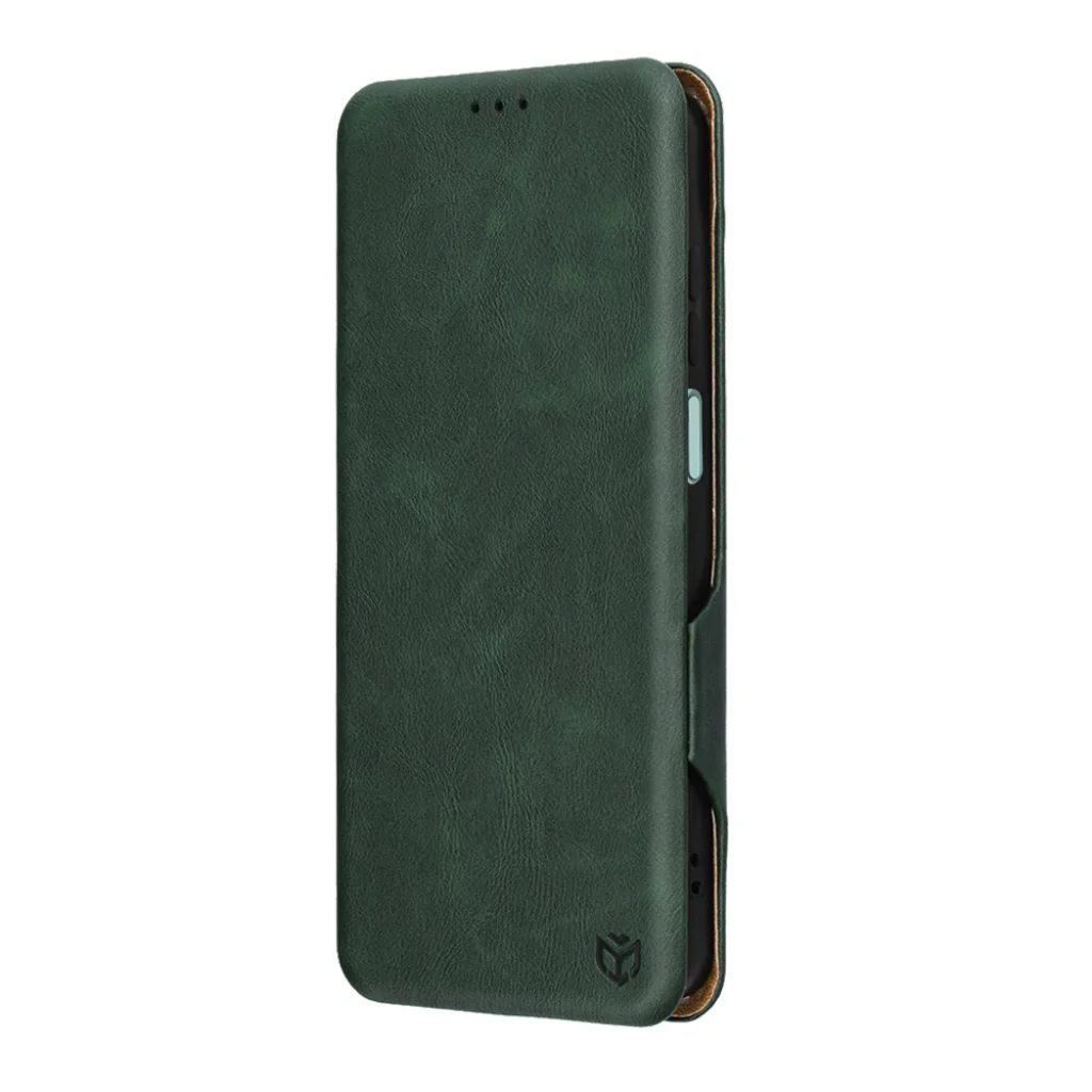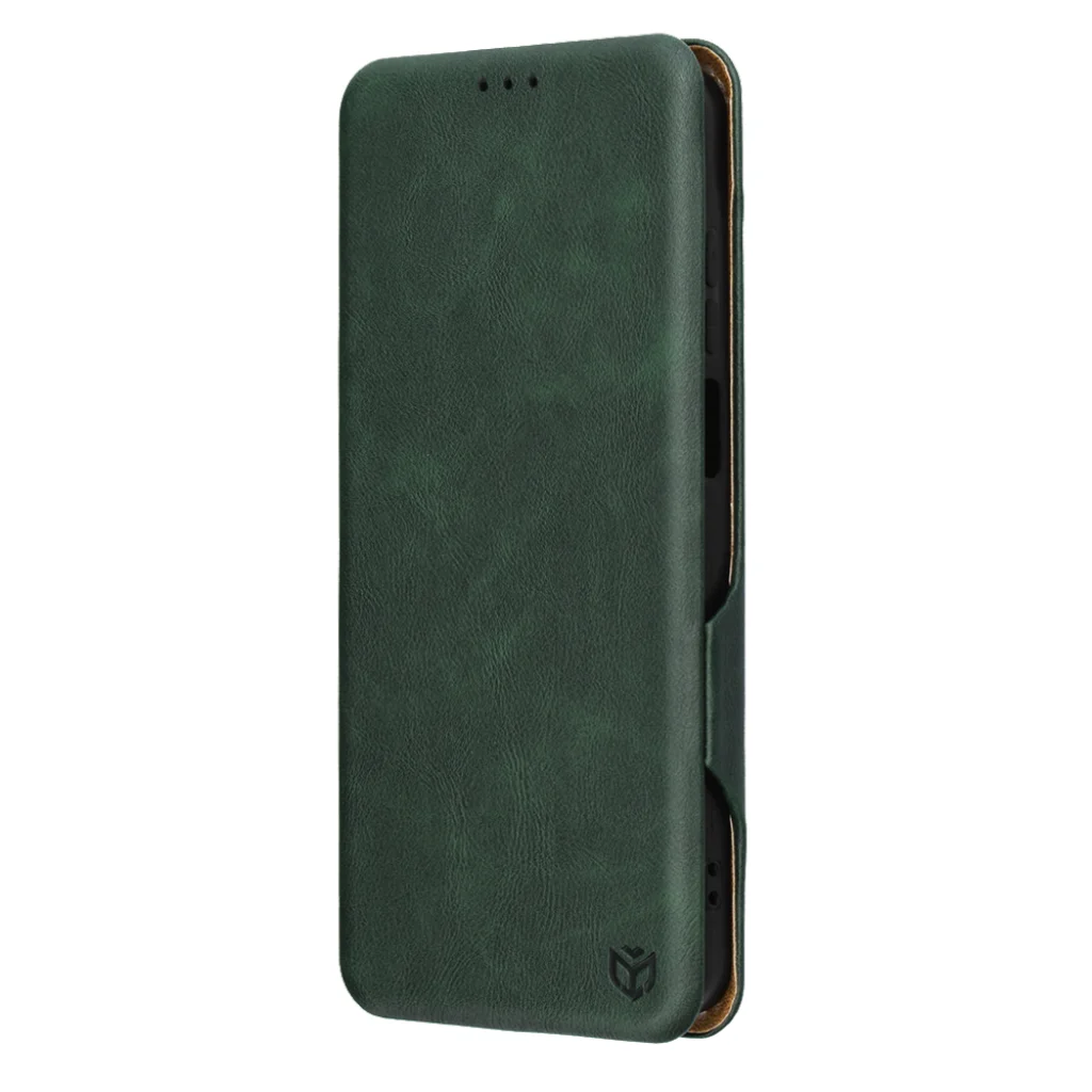 - Kifinomult megjelenés: A tok texturált, sötétzöld felülete klasszikus és kifinomult stílust kölcsönöz telefonjának. A belső rész elegáns, kontrasztos barna színben pompázik.