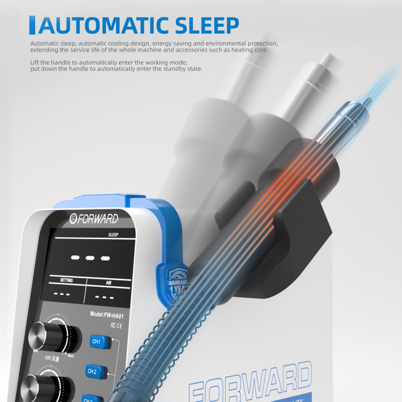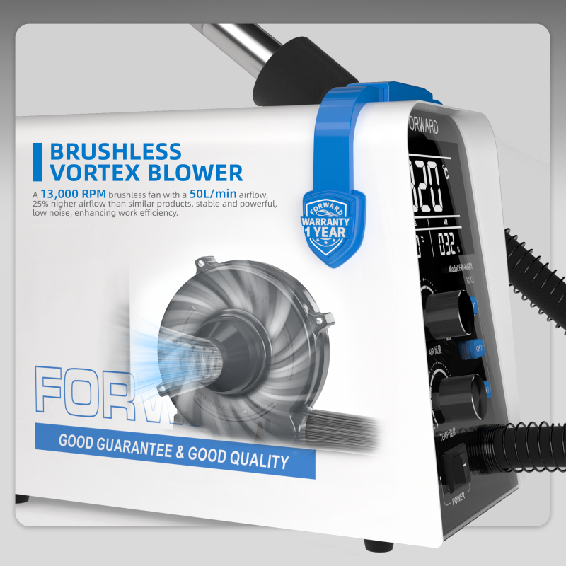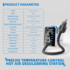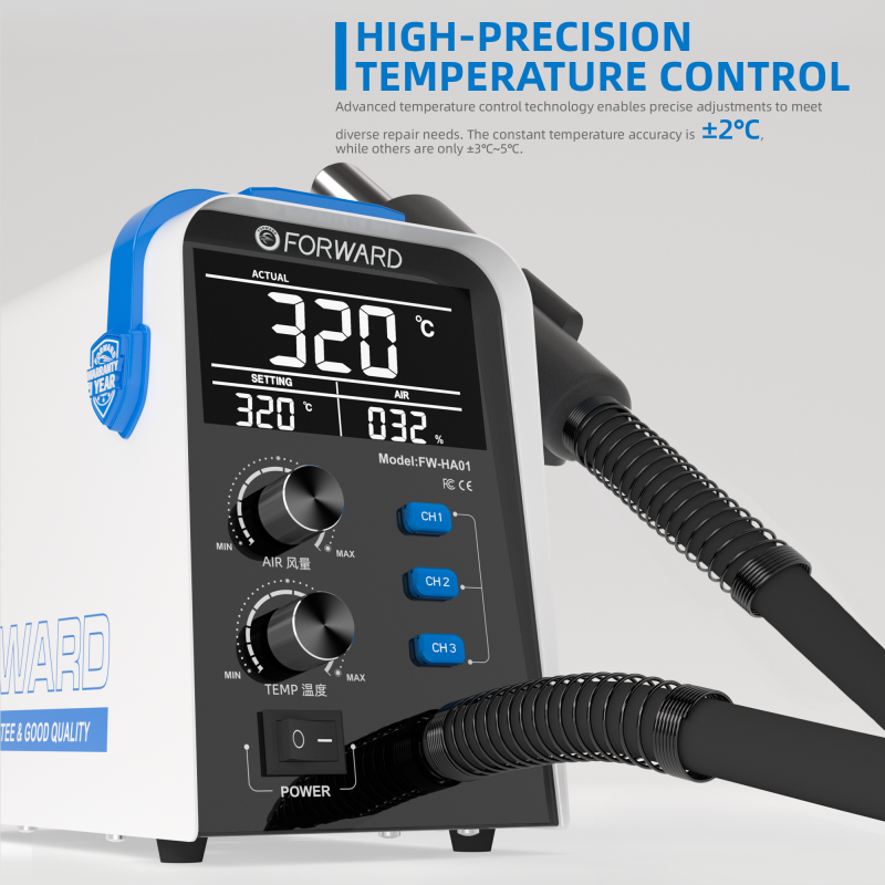 A Hot Air Rework Station Forward FW-HA01 fejlett hőmérséklet-szabályozási technológiája lehetővé teszi a pontos beállításokat, hogy különböző javítási igényeknek megfeleljen. A hőmérséklet pontossága +/-2 Celsius-fok, szemben más készülékekkel, amelyek csak +/-3-5 Celsius-fok pontosságot kínálnak.