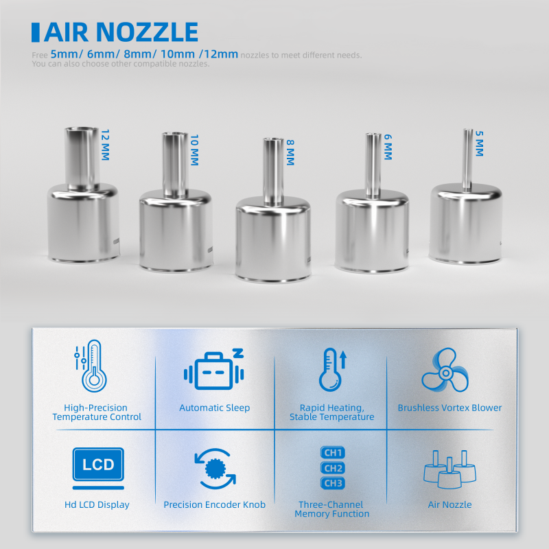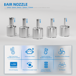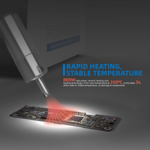 Gyors felmelegedés, stabil hőmérséklet: 800W teljesítmény és kerámia fűtőmag biztosítja, hogy a készülék szobahőmérsékletről 350 Celsius-fokra melegedjen mindössze 3 másodperc alatt, szemben más készülékekkel, amelyek 6 másodpercet igényelnek. A hőmérséklet stabil marad, így elkerülhető a komponensek károsodása.