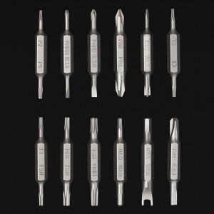 - 12x reversible C4 x 30 mm bits (flat: SL1.5 / SL2, Phillips: PH000 / PH00 / PH0 / PH1, Allen: H1.5 / H2 / H2.5, Torx: T2 / T3 / T4 / T5 / T6 / T8 / T9 / T10, U-shaped: U2.6, Y-shaped: Y0.6, W-shaped: W1.5, Tri-Wing: TW1, Triangular: 2.3, pentagonal: P2 / P5