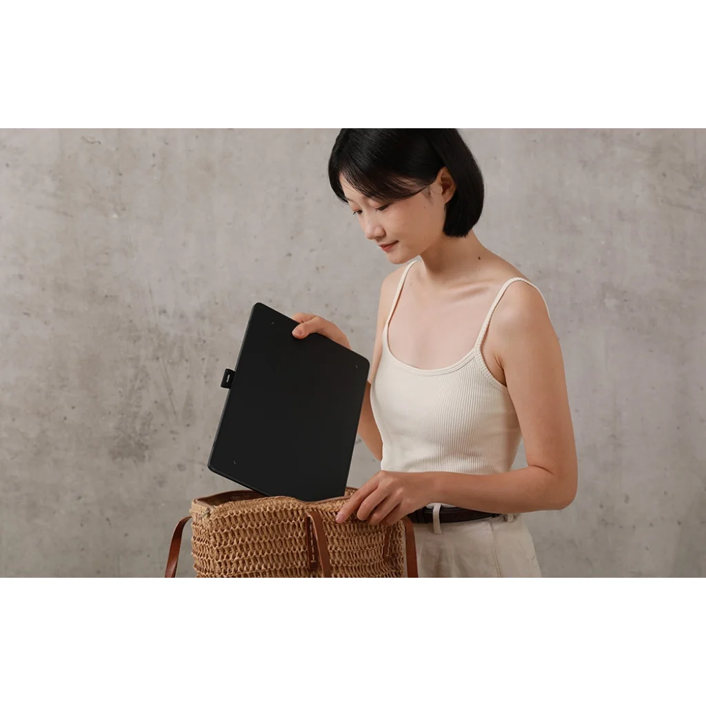 A tábla felülete a papír textúráját utánozza, ami természetes rajzolási élményt nyújt. Ezáltal a munka pontosabbá és kevésbé fárasztóvá válik a kéz számára. Az enyhén lejtő élek és a csuklót alacsonyabbra támasztó támasz biztosítja, hogy a kéz még hosszabb munkamenetek során sem fárad el, a szimmetrikus kialakításnak köszönhetően pedig a táblagép a jobb- és balkezes felhasználók számára is kényelmes. Mivel a tokról hiányoznak a funkciógombok, szabadon használhatja saját billentyűzetét, és a táblagépet úgy helyezheti el, ahogyan az Önnek kényelmes - mindenféle korlátozás nélkül.