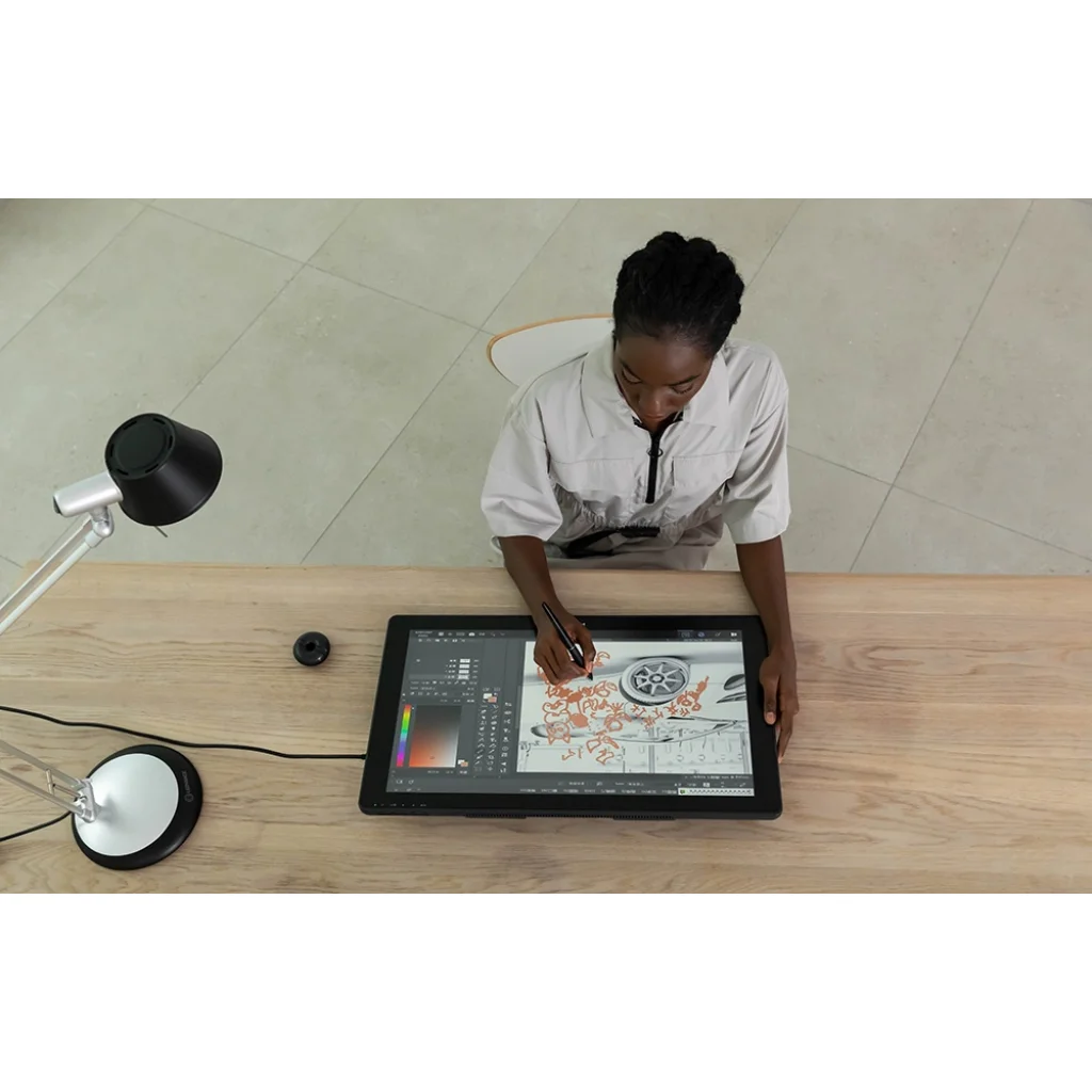 A Kamvas 24 Plus 23,8 hüvelykes, 2560 x 1440 px (QHD) felbontású képernyővel rendelkezik, amely lehetővé teszi, hogy szabadon dolgozhasson egy nagy vásznon anélkül, hogy folyamatosan nagyítania és pásztáznia kellene a keretet. Munkájának minden részlete tökéletesen látható lesz, így jobban áttekintheti a teljes kompozíciót, és nagyobb kontrollt gyakorolhat a végeredmény felett.