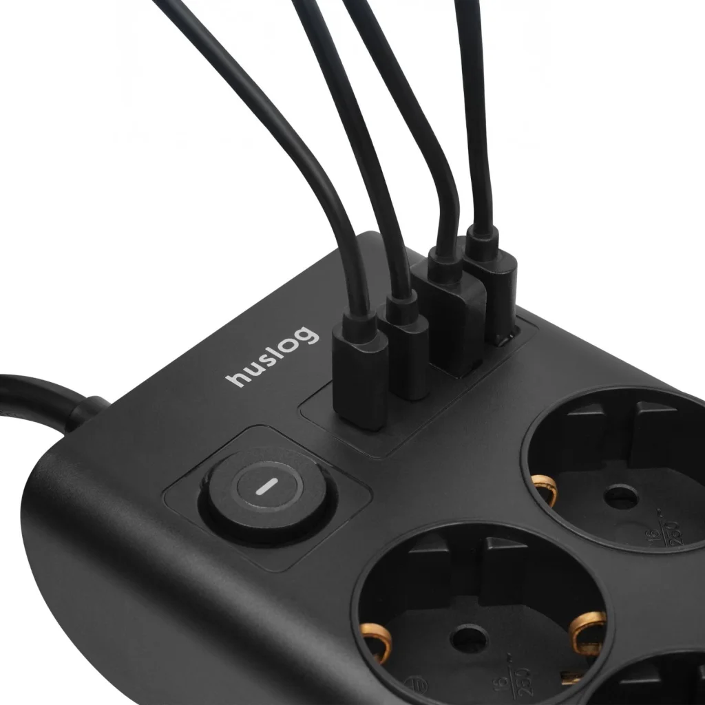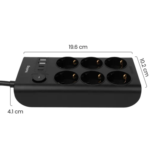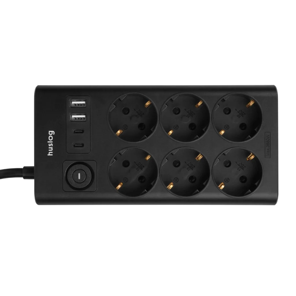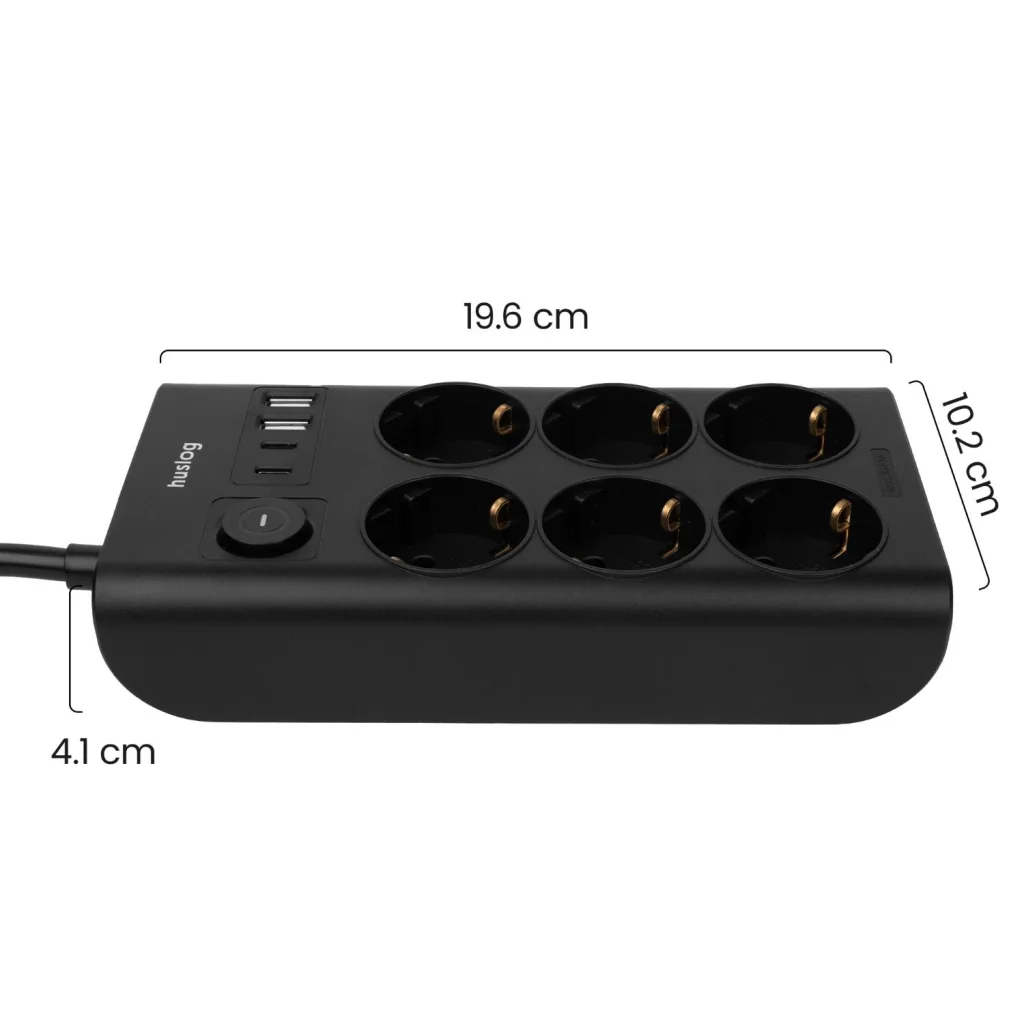 A toldó 6 Schuko aljzattal rendelkezik, kompatibilis a legtöbb európai eszközzel, biztonságos és stabil működést biztosít. Az USB portokkal 2 USB-A (2,4 A) és 2 USB-C (3 A) port, egyszerre akár 4 mobil eszköz gyors feltöltése lehetséges. A PP ház ellenáll a hőmérsékleti viszonyoknak, minimalizálja a túlmelegedés kockázatát. A központi BE/KI kapcsoló energiát spórol. 1,5 m hosszú tápkábel szabad elhelyezést tesz lehetővé. A 3680 W-os teljesítmény biztonságosan táplál nagy teljesítményű eszközöket túlfeszültség kockázata nélkül.