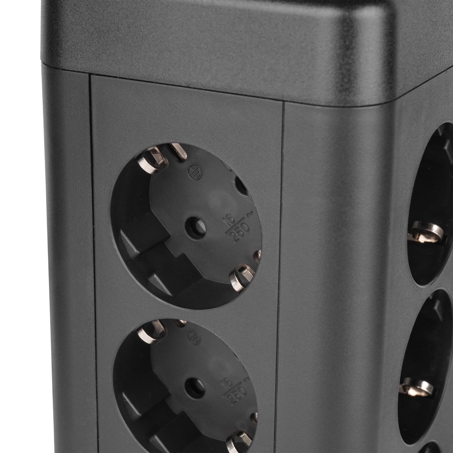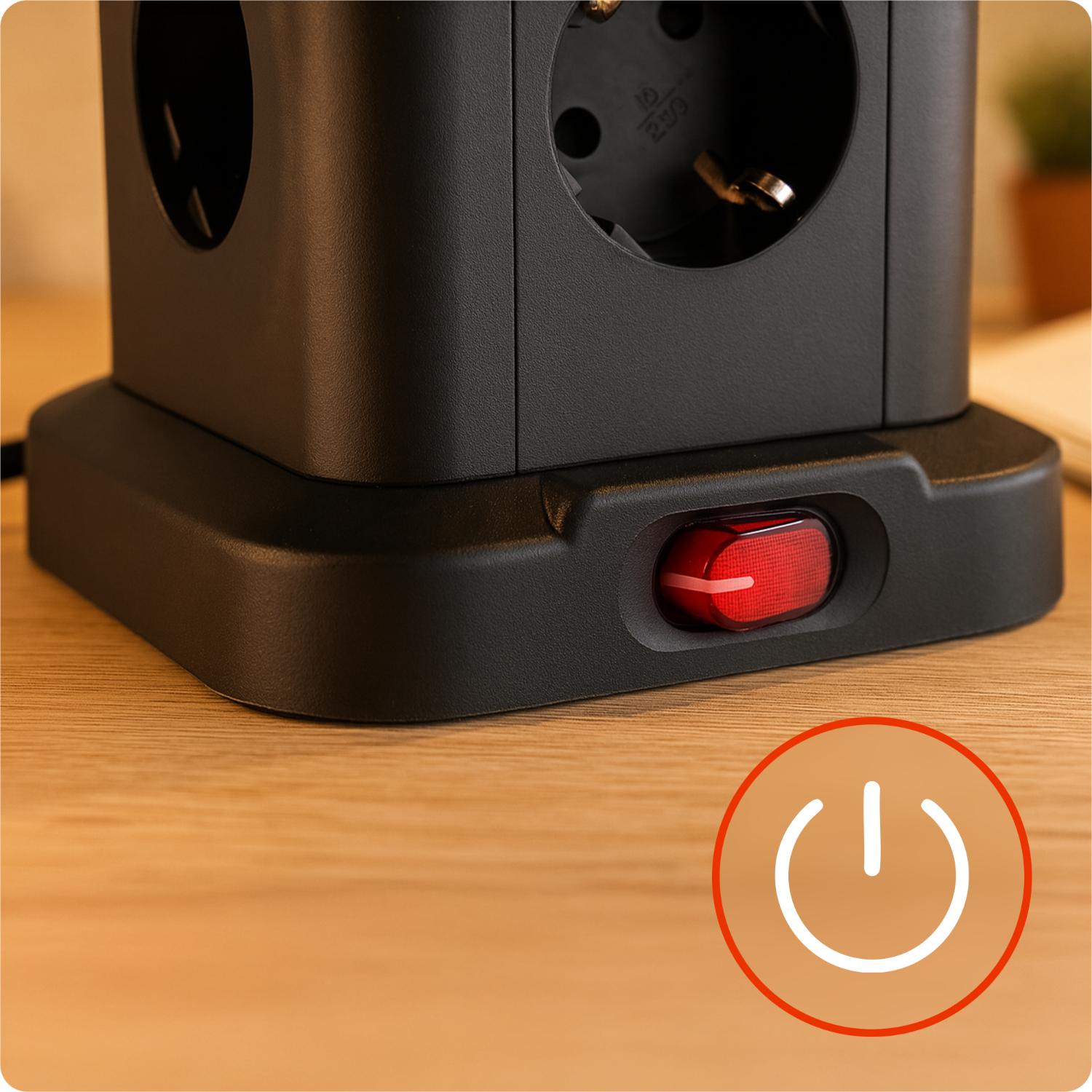 - Függőleges, helytakarékos kialakítás: Az innovatív torony design minimalizálja az asztalon vagy a padlón elfoglalt helyet, miközben minden oldalról könnyen hozzáférhetővé teszi az aljzatokat.