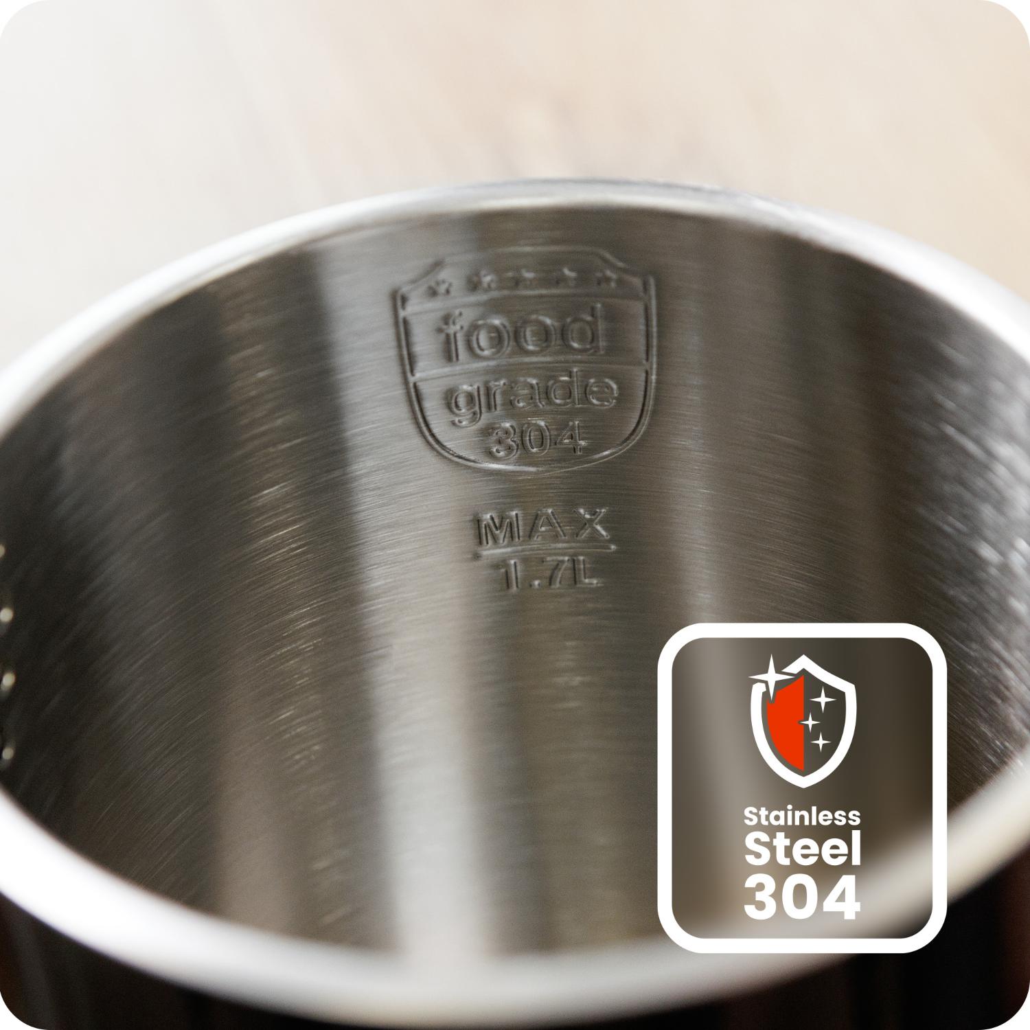 - Prémium minőségű 304-es rozsdamentes acél belső: A belső tartály élelmiszer-biztonsági minősítésű (Food Grade 304) rozsdamentes acélból készült, amely garantálja a tartósságot, a higiénikus használatot és a könnyű tisztíthatóságot. A vízforraló hosszú távon megőrzi az italok eredeti ízét.