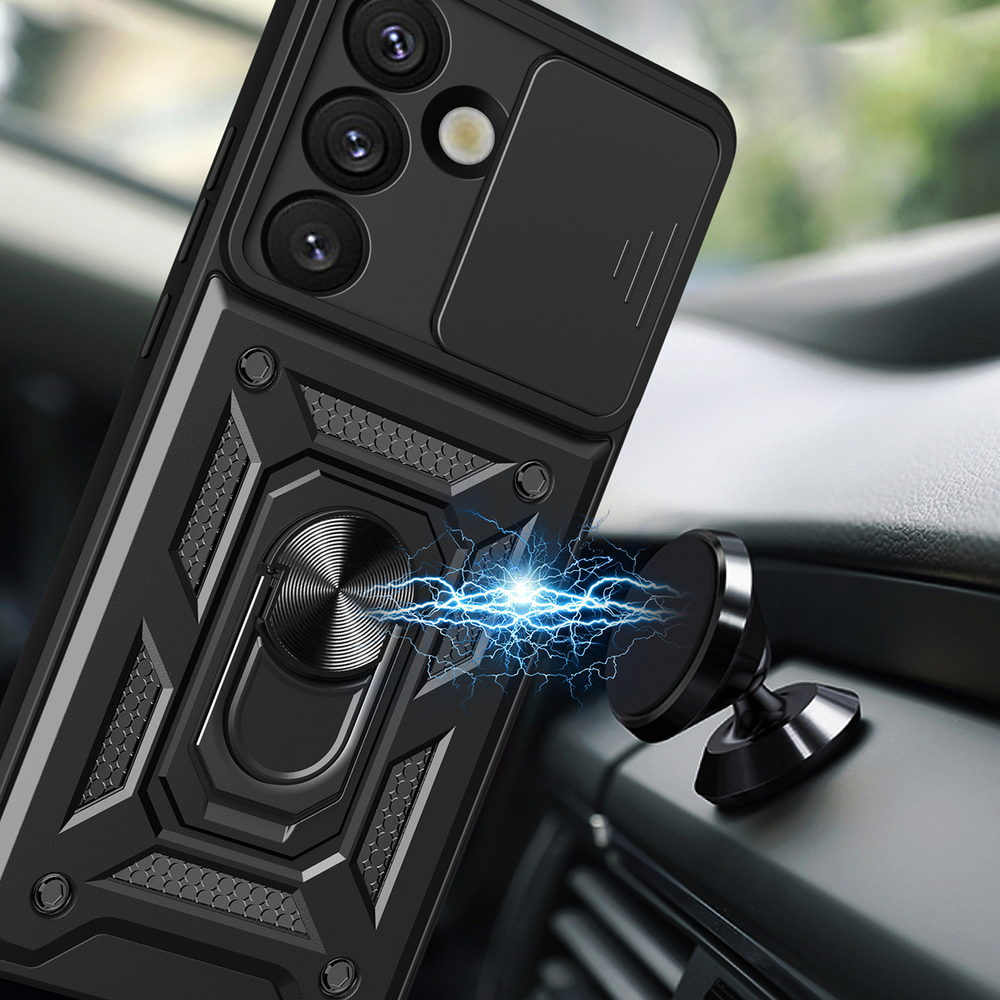 ~ Megerősített konstrukció a telefon védelme érdekében Két anyagból: TPU és PC kialakított szerkezet hatékonyan védi az okostelefon házát a mindennapi mechanikai sérülésektől. Integrált kamera fedél A csúszó kamera fedél megvédi az objektíveket használaton kívül, csökkentve a karcolások kockázatát. Fémgyűrű a fokozott biztonság érdekében A gyűrű megkönnyíti a telefon biztonságos tartását a kézben, és javítja az egykezes használat kényelmét. Kényelmes állvány funkció A telefon vízszintes helyzetben történő elhelyezése megkönnyíti a filmek nézését és a tartalmak olvasását a képernyőn. Illeszkedik a Samsung Galaxy S26 Ultra készülékhez A precíz kivágások lehetővé teszik az összes telefonfunkció használatát a tok eltávolítása nélkül.